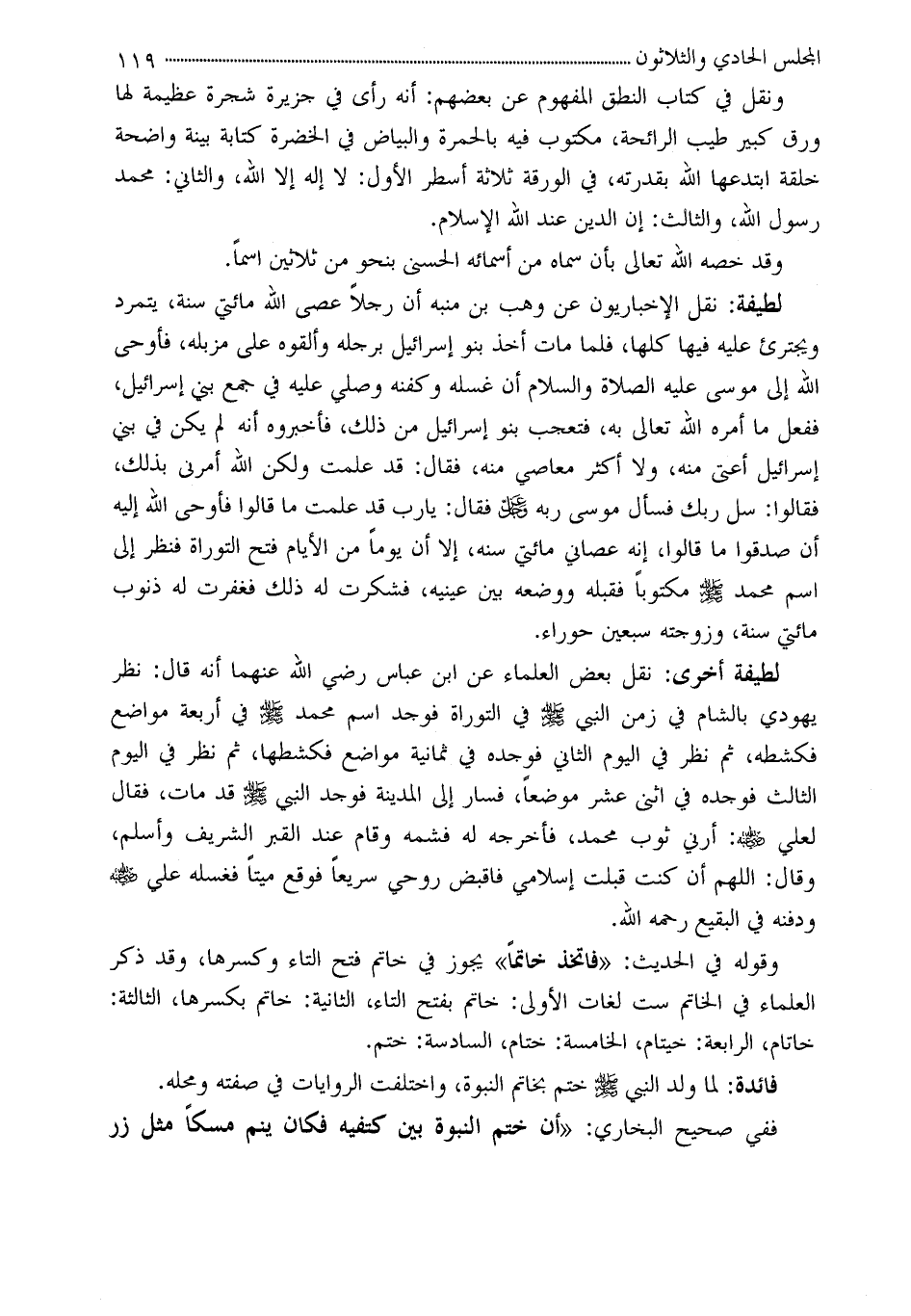 لطيفة: نقل الإخباريون عن وهب بن منبه أن رجلاً عصى الله مائتي سنة، يتمرد ويجترئ عليه فيها كلها، فلما مات أخذ بنو إسرائيل برجله وألقوة على مزبله، فأوحى الله إلى موسى عليه الصلاة والسلام أن غسله وكفنه وصلي عليه في جمع بني إسرائيل، ففعل ما أمره الله تعالى به، فتعجب بنو إسرائيل من ذلك، فأخبروه أنه لم يكن في بني إسرائيل أعتى منه، ولا أكثر معاصي منه، فقال: قد علمت ولكن الله أمرنى بذلك، فقالوا: سل ربك فسأل موسى ربه - عز وجل - فقال: يارب قد علمت ما قالوا فأوحى الله إليه أن صدقوا ما قالوا، إنه عصاني مائتي سنه، إلا أن يوماً من الأيام فتح التوراة فنظر إلى اسم محمد - صلى الله عليه وسلم - مكتوباً فقبله ووضعه بين عينيه، فشكرت له ذلك فغفرت له ذنوب مائتي سنة، وزوجته سبعين حوراء.