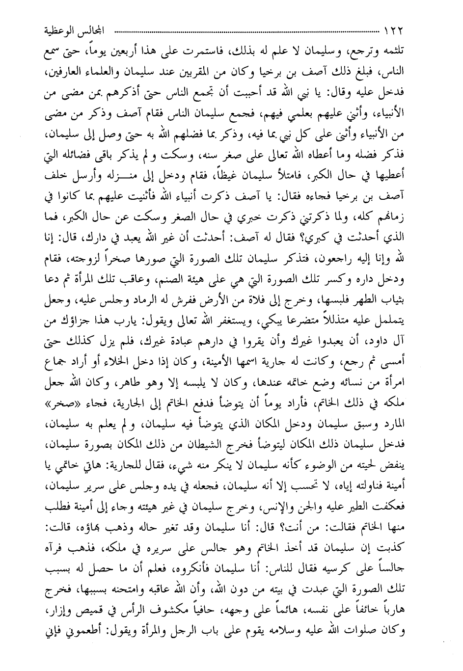 بما كانوا في زمانهم كله، ولما ذكرتني ذكرت خبري في حال الصغر وسكت عن حال الكبر، فما الذي أحدثت في كبري؟ فقال له آصف: أحدثت أن غير الله يعبد في دارك، قال: إنا لله وإنا إليه راجعون، فتذكر سليمان تلك الصورة التي صورها صخراً لزوجته، فقام ودخل داره وكسر تلك الصورة التي هي على هيئة الصنم، وعاقب تلك المرأة ثم دعا بثياب الطهر فلبسها، وخرج إلى فلاة من الأرض ففرش له الرماد وجلس عليه، وجعل يتململ عليه متذللاً متضرعا يبكي، ويستغفر الله تعالى ويقول: يارب هذا جزاؤك من آل داود، أن يعبدوا غيرك وأن يقروا في دارهم عبادة غيرك، فلم يزل كذلك حتى أمسى ثم رجع، وكانت له جارية اسمها الأمينة، وكان إذا دخل الخلاء أو أراد جماع امرأة من نسائه وضع خاتمة عندها، وكان لا يلبسه إلا وهو طاهر، وكان الله جعل ملكه في ذلك الخاتم، فأراد يوماً أن يتوضأ فدفع الخاتم إلى الجارية، فجاء «صخر» المارد وسبق سليمان ودخل المكان الذي يتوضأ فيه سليمان، ولم يعلم به سليمان، فدخل سليمان ذلك المكان ليتوضأ فخرج الشيطان من ذلك المكان بصورة سليمان، ينفض لحيته من الوضوء كأنه سليمان لا ينكر منه شيء، فقال للجارية: هاتي خاتمي يا أمينة فناولته إياه، لا تحسب إلا أنه سليمان، فجعله في يده وجلس على سرير سليمان، فعكفت الطير عليه والجن والإنس، وخرج سليمان في غير هيئته وجاء إلى أمينة فطلب منها الخاتم فقالت: من أنت؟ قال: أنا سليمان وقد تغير حاله وذهب بهاؤه، قالت: كذبت إن سليمان قد أخذ الخاتم وهو جالس على سريره في ملكه، فذهب فرآه جالساً على كرسيه فقال للناس: أنا سليمان فأنكروه، فعلم أن ما حصل له بسبب تلك الصورة التي عبدت في بيته من دون الله، وأن الله عاقبه وامتحنه بسببها، فخرج هارباً خائفاً على نفسه، هائماً على وجهه، حافياً مكشوف الرأس في قميص وإزار، وكان صلوات الله عليه وسلامه يقوم على باب الرجل والمرأة ويقول: أطعموني فإني