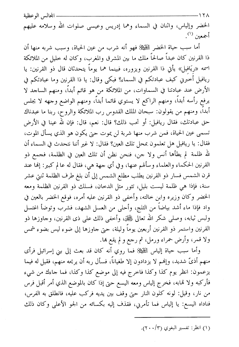 أما سبب حياة الخضر - عليه السلام - فهو أنه شرب من عين الحياة، وسبب شربه منها أن ذا القرنين كان عبداً صالحاً ملك ما بين المشرق والمغرب، وكان له خليل من الملائكة اسمه «رِيَافِيل» يأتي ذا القرنين ويزوره، فبينما هما يوماً يتحدثان قال ذو القرنين: يا ريافيل أخبرني كيف عبادتكم في السماء؟ فبكى وقال: يا ذا القرنين وما عبادتكم في الأرض عند عبادتنا في السماوات، من الملائكة من هو قائم أبداً، ومنهم الساجد لا يرفع رأسه أبداً، ومنهم الراكع لا يستوي قائما أبداً، ومنهم الواضع وجهه لا يجلس أبداً، ومنهم من يقولون: سبحان الملك القدوس رب الملائكة والروح، ربنا ما عبدناك حق عبادتك، فقال ريافيل: أو تحب ذلك؟ قال: نعم، قال: فإن لله عينا في الأرض تسمى عين الحياة، فمن شرب منها شربة لن يموت حتى يكون هو الذي يسأل الموت، فقال: يا ريافيل هل تعلمون بمحل تلك العين؟ فقال: لا غير أننا نتحدث في السماء أن لله ظلمة لم يطأها أنس ولا جن، فنحن نظن أن تلك العين في الظلمة، فجمع ذو القرنين الحكماء والعلماء وسألهم عنها، وفي أي جهة هي، فقال له عالم كبير: إنها عند قرن الشمس فسار ذو القرنين يطلب مطلع الشمس إلى أن بلغ طرف الظلمة ثنتي عشر سنة، فإذا هي ظلمة ليست بليل، تثور مثل الدخان، فسلك ذو القرنين الظلمة ومعه الخضر وكان وزيره وابن خالته، وأخفى ذو القرنين عليه أمره، فوقع الخضر بالعين في واد فإذا ماء أشد بياضاً من الثلج، وأحلى من العسل الشهد، فشرب وتوضأ اغتسل ولبس ثيابه، وصلى شكر الله تعالى - عز وجل -، وأخفى ذلك على ذى القرنين، وجاوزها ذو القرنين واستمر ذو القرنين أربعين يوماً وليلة، حتى جاوزها إلى ضوء ليس بضوء شمس ولا قمر، وأرض حمراء ورمل، ثم رجع ولم يقع بها.