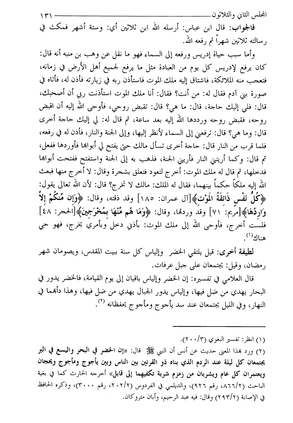 وأما سبب حياة إدريس ورفعه إلى السماء فهو ما نقل عن وهب بن منبه أنه قال: كان يرفع لإدريس كل يوم من العبادة مثل ما يرفع لجميع أهل الأرض في زمانه، فتعجب منه الملائكة، فاشتاق إليه ملك الموت فاستأذن ربه في زيارته فأذن له، فأتاه في صورة بني آدم فقال له: من أنت؟ فقال: أنا ملك الموت استأذنت ربي أن أصحبك، قال: فلي إليك حاجة، قال: ما هي؟ قال: تقبض روحي، فأوحى الله إليه أن اقبض روحه، فقبض روحه ورددها الله إليه بعد ساعة، ثم قال له: لي إليك حاجة أخرى قال: وما هي؟ قال: ترفعني إلى السماء لأنظر إليها، وإلى الجنة والنار، فأذن له في رفعه، فلما قرب من النار قال: حاجة أخرى تسأل مالك حتى يفتح لي أبوابها فأوردها ففعل، ثم قال: وكما أريتني النار فأريني الجنة، فذهب به إلى الجنة واستفتح ففتحت أبوابها فدخلها، ثم قال له ملك الموت: أخرج لتعود فتعلق بشجرة وقال: لا أخرج منها فبعث الله إليه ملكاً حكماً بينهما، فقال له الملك: مالك لا تخرج؟ قال: لأن الله تعالى يقول: ?كُلُّ نَفْسٍ ذَائِقَةُ المَوْتِ? [آل عمران: 185] وقد ذقته، وقال: ?وَإِن مِّنكُمْ إِلاَّ وَارِدُهَا? [مريم: 71] وقد وردتها، وقال: ?وَمَا هُم مِّنْهَا بِمُخْرَجِينَ? [الحجر: 48] فلست أخرج، فأوحى الله إلى ملك الموت: بأذني دخل وبأمري يخرج، فهو حي هناك (¬1) .