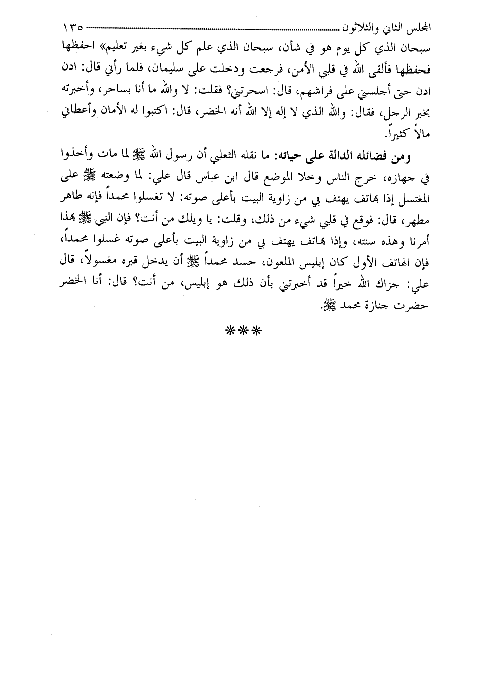 ومن فضائله الدالة على حياته: ما نقله الثعلبي أن رسول الله - صلى الله عليه وسلم - لما مات وأخذوا في جهازه، خرج الناس وخلا الموضع قال ابن عباس قال علي: لما وضعته - صلى الله عليه وسلم - على المغتسل إذا بهاتف يهتف بي من زاوية البيت بأعلى صوته: لا تغسلوا محمداً فإنه طاهر مطهر، قال: فوقع في قلبي شيء من ذلك، وقلت: يا ويلك من أنت؟ فإن النبي - صلى الله عليه وسلم - بهذا أمرنا وهذه سنته، وإذا بهاتف يهتف بي من زاوية البيت بأعلي صوته غسلوا محمداً، فإن الهاتف الأول كان إبليس الملعون، حسد محمداً - صلى الله عليه وسلم - أن يدخل قبره مغسولاً، قال علي: جزاك الله خيراً قد أخبرتني بأن ذلك هو إبليس، من أنت؟ قال: أنا الخضر حضرت جنازة محمد - صلى الله عليه وسلم -.