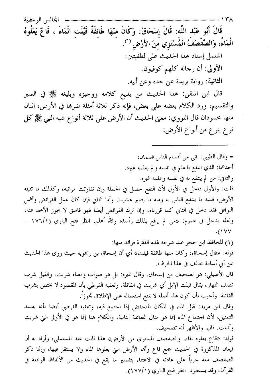 قال ابن الملقن: هذا الحديث من بديع كلامه ووجيزه وبليغه - صلى الله عليه وسلم - في السبر والتقسيم، ورد الكلام بعضه على بعض، فإنه ذكر ثلاثة أمثلة ضربها في الأرض، اثنان منها محمودان قال النووي: معنى الحديث أن الأرض على ثلاثة أنواع شبه النبي - صلى الله عليه وسلم - كل نوع بنوع من أنواع الأرض: