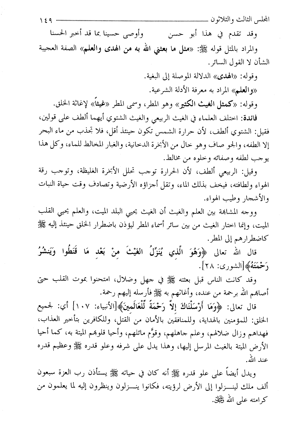 ووجه المشابهة بين العلم والغيث أن الغيث يحيي البلد الميت، والعلم يحيي القلب الميت، وإنما اختار الغيث من بين سائر المطر أسماء المطر ليؤذن باضطرار الخلق حينئذ إليه - صلى الله عليه وسلم - كاضطرارهم إلى المطر.
