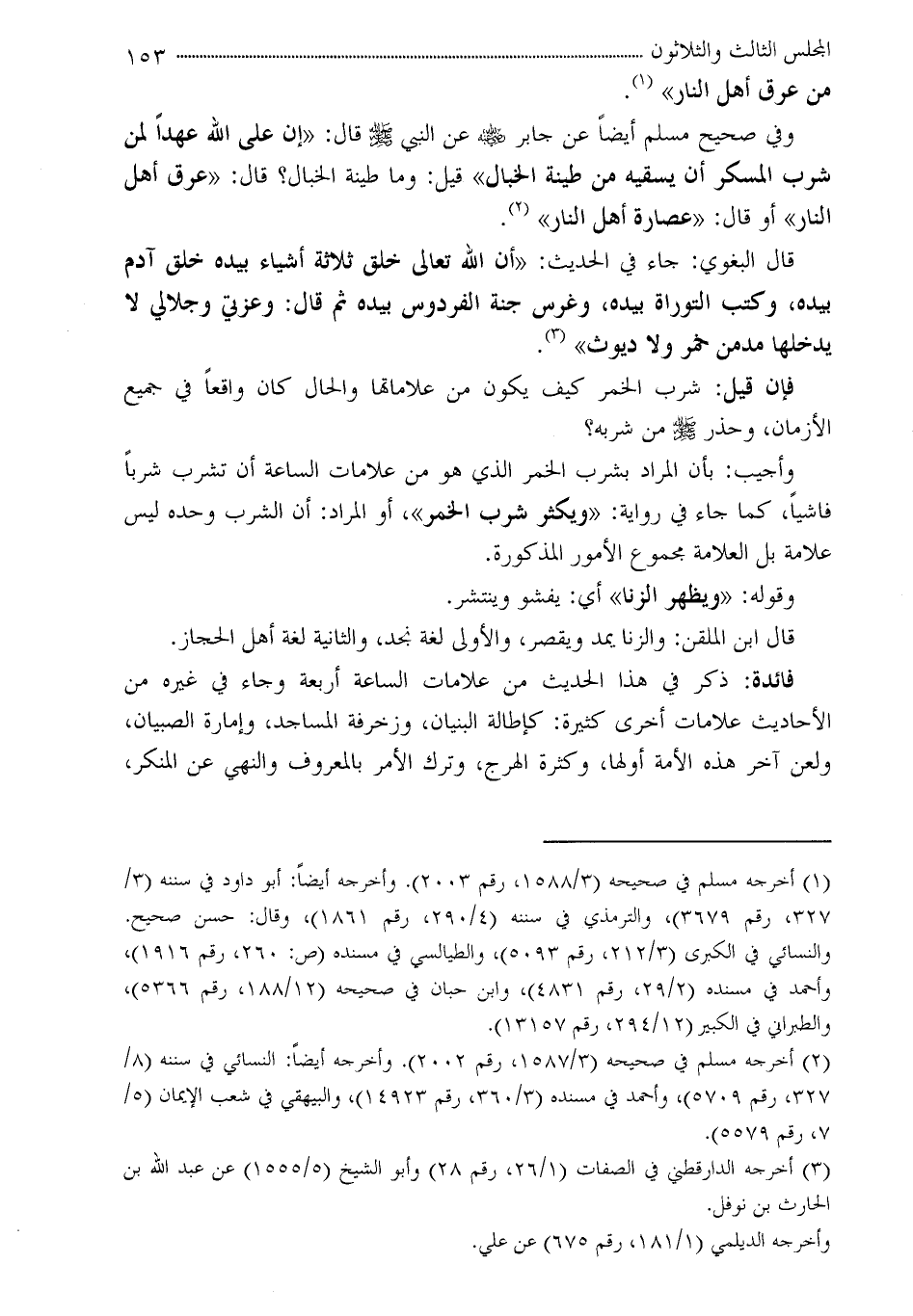 وفي صحيح مسلم أيضاً عن جابر - رضي الله عنه - عن النبي - صلى الله عليه وسلم - قال: «إن على الله عهداً لمن شرب المسكر أن يسقيه من طينة الخبال» قيل: وما طينة الخبال؟ قال: «عرق أهل النار» أو قال: «عصارة أهل النار» (¬2) .