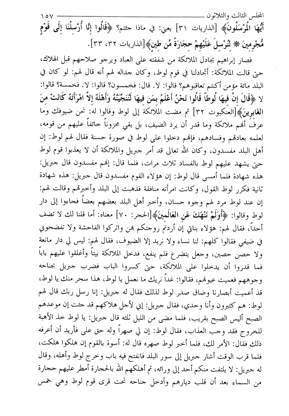فصار إبراهيم يجادل الملائكة من شفقته على العباد ويرجو صلاحهم قبل الهلاك، حتى قالت الملائكة: أتجادلنا في قوم لوط، وكان جدالة لهم أنه قال لهم: لو كان في البلد مائة مؤمن أكنتم تعاقبوهم؟ قالوا: لا. قال: فخمسون؟ قالوا: لا. فخمسة؟ قالوا: لا ?قَالَ إِنَّ فِيهَا لُوطاً قَالُوا نَحْنُ أَعْلَمُ بِمَن فِيهَا لَنُنَجِّيَنَّهُ وَأَهْلَهُ إِلاَّ امْرَأَتَهُ كَانَتْ مِنَ الغَابِرِينَ? [العنكبوت 32] ثم مضت الملائكة إلى لوط وقالوا له: نحن ضيوفك وما عرف أنهم ملائكة وما قدر أن يرد الضيف، بل بقي محزوناً خائفاً عليهم من قومه، لعلمه بعادتهم وفسادهم، فإنهم دخلوا على لوط في صورة حسنة فقال لهم لوط: إن أهل البلد مفسدون، وكان الله تعالى قد أمر جبريل والملائكة أن لا يعذبوا قوم لوط حتى يشهد عليهم لوط بالفساد ثلاث مرات، فلما قال: إنهم مفسدون قال جبريل: هذه شهادة فلما أمسى قال لوط: إن هؤلاء القوم مفسدون قال جبريل: هذه شهادة ثانية فكرر لوط القول، وكانت امرأته منافقة فذهبت إلى البلد وأخبرتهم وقالت لهم: إن عند لوط مرد لهم وجوه حسان، وأخبر أهل البلد بعضهم بعضاً فجاءوا إلى دار لوط وقالوا: ?أَوَلَمْ نَنْهَكَ عَنِ العَالَمِينَ? [الحجر: 70] معناه: أما قلنا لك لا تضف أحداً، فقال لهم: هؤلاء بناتي إن أردتم زوجتكم بهن واتركوا الفاحشة ولا تفضحوني في ضيفي فقالوا كلهم: لنا نساء ولا نريد إلا الضيوف، فقال لهم: ليس لي دار مانعة ولا حصن حصين، وجعل يتضرع فلم ينفع، فدخل الملائكة بيتاً وأغلقوا عليهم باباً فما قدروا أن يدخلوا على الملائكة، حتى كسروا الباب فضرب جبريل بجناحه وجوههم فعميت عيونهم، فقالوا: غداً نريك ما نعمل يا لوط، هذا سحر منك يا لوط، قد أعميت أبصارنا وضاق صدر لوط لذلك فقال له جبريل: إنا رسل ربك قال لهم لوط: هم كثيرون وأنا وحدي، فقال جبريل: إني لأجل هلاكهم قد جئت إن موعدهم الصبح أليس الصبح بقريب، فلما مضى من الليل