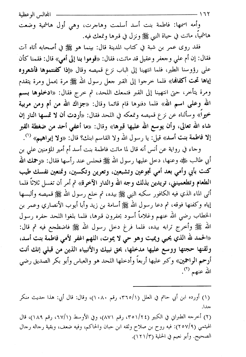 وجاء في رواية عن أنس أنه قال لما ماتت فاطمة بنت أسد أم أمير المؤمنين علي بن أبي طالب - رضي الله عنه - وعنها، دخل عليها رسول الله - صلى الله عليه وسلم - فجلس عند رأسها فقال: «رحمك الله كنت بأبي وأمي بعد أمي تجوعين وتشبعين، وتعرين وتكسين، وتمنعي نفسك طيب الطعام وتطعميني، تريدين بذلك وجه الله والدار الآخرة» ثم أمر أن تغسل ثلاثاً فلما أتى الماء الذي فيه الكافور سكبه النبي - صلى الله عليه وسلم - بيده، ثم خلع رسول الله - صلى الله عليه وسلم - قميصه وألبسها إياه وكفنها فوقه، ثم دعا رسول الله - صلى الله عليه وسلم - أسامة بن زيد وأبا أيوب الأنصاري وعمر بن الخطاب رضي الله عنهم وغلاماً أسود يحفرون قبرها، فلما بلغوا اللحد حفره رسول الله - صلى الله عليه وسلم - وأخرج ترابه بيده، فلما فرغ دخل رسول الله - صلى الله عليه وسلم - فاضطجع فيه ثم قال: «الحمد لله الذي يحي ويميت وهو حي لا يموت، اللهم اغفر لأمي فاطمة بنت أسد، ولقنها حجتها ووسع عليها مدخلها، بحق نبيك والأنبياء الذين من قبلي إنك أنت ارحم الراحمين» وكبر عليها أربعاً وأدخلها اللحد هو والعباس وأبو بكر الصديق رضي الله عنهم (¬2) .