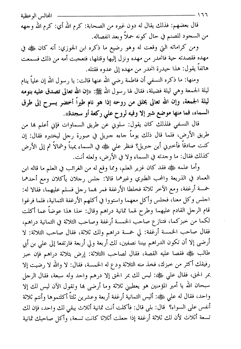 ومنها: ما ذكره النسفي أن فاطمة رضي الله عنها قالت: يا رسول الله إن علياً ينام ليلة الجمعة وهي ليلة فضيلة، فقال لها رسول الله - صلى الله عليه وسلم -: «إن الله تعالى تصدق عليه بنومه ليلة الجمعة، وإن الله تعالى يخلق من روحه إذا هو نام طيراً أخضر يسرح إلى طرق السماء، فما منها موضع شبر إلا وفيه لروح علي ركعة أو سجدة» .