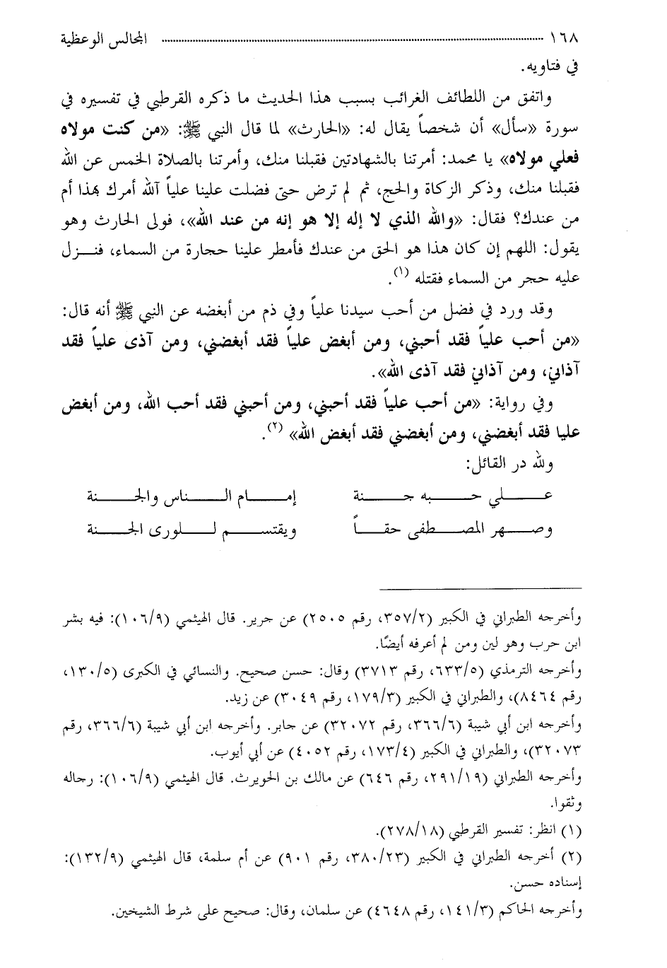 واتفق من اللطائف الغرائب بسبب هذا الحديث ما ذكره القرطبي في تفسيره في سورة «سأل» أن شخصاً يقال له: «الحارث» لما قال النبي - صلى الله عليه وسلم -: «من كنت مولاه فعلي مولاه» يا محمد: أمرتنا بالشهادتين فقبلنا منك، وأمرتنا بالصلاة الخمس عن الله فقبلنا منك، وذكر الزكاة والحج، ثم لم ترض حتى فضلت علينا علياً آلله أمرك بهذا أم من عندك؟ فقال: «والله الذي لا إله إلا هو إنه من عند الله» ، فولى الحارث وهو يقول: اللهم إن كان هذا هو الحق من عندك فأمطر علينا حجارة من السماء، فنزل عليه حجر من السماء فقتله (¬1) .