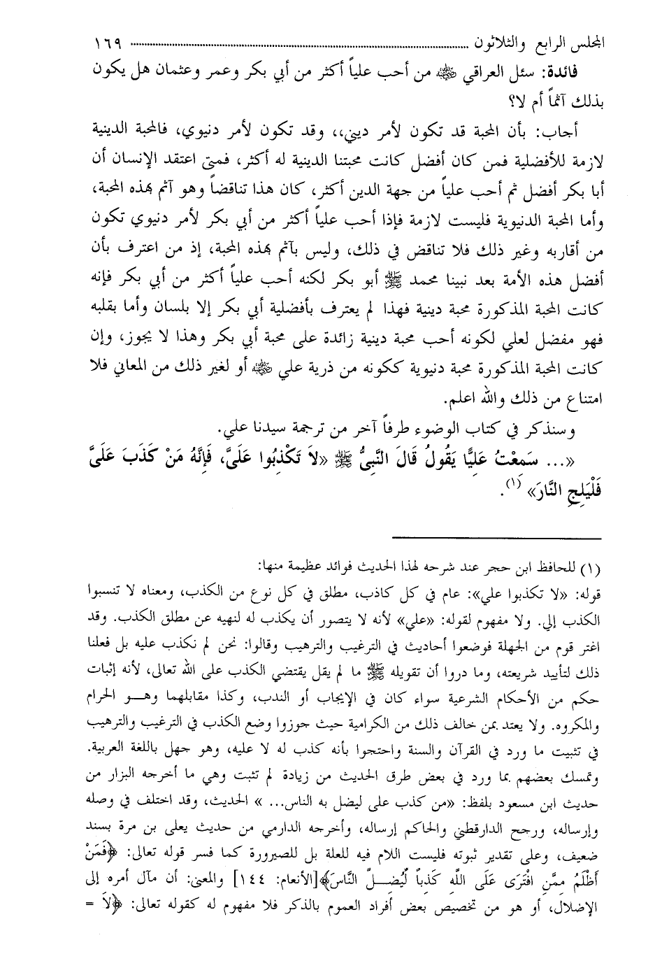 فائدة: سئل العراقي - رضي الله عنه - من أحب علياً أكثر من أبي بكر وعمر وعثمان هل يكون بذلك آثماً أم لا؟