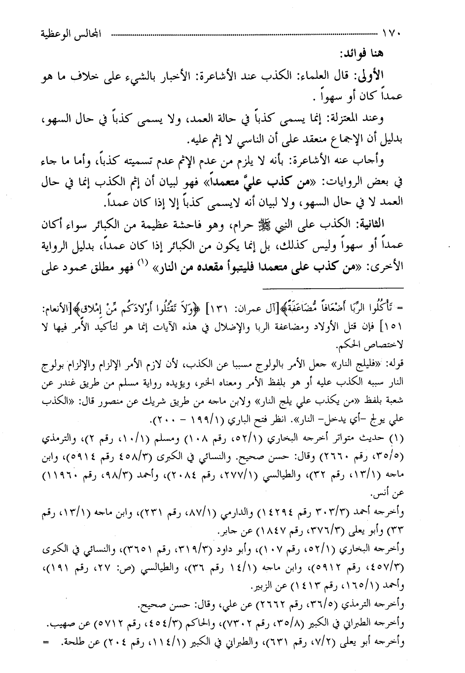الثانية: الكذب على النبي - صلى الله عليه وسلم - حرام، وهو فاحشة عظيمة من الكبائر سواء أكان عمداً أو سهواً وليس كذلك، بل إنما يكون من الكبائر إذا كان عمداً، بدليل الرواية الأخرى: «من كذب على متعمدا فليتبوأ مقعده من النار» (¬1)