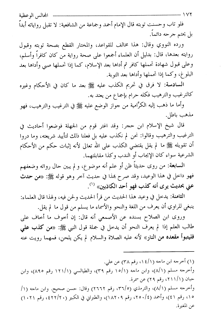 السابعة: من روى حديثاً ظن أو علم أنه موضوع، ولم يبين حال رواته وضعفهم فهو داخل في هذا الوعيد، وقد صرح بهذا في حديث آخر وهو قوله - صلى الله عليه وسلم -: «من حدث عني بحديث يرى أنه كذب فهو أحد الكاذبين» (¬1) .