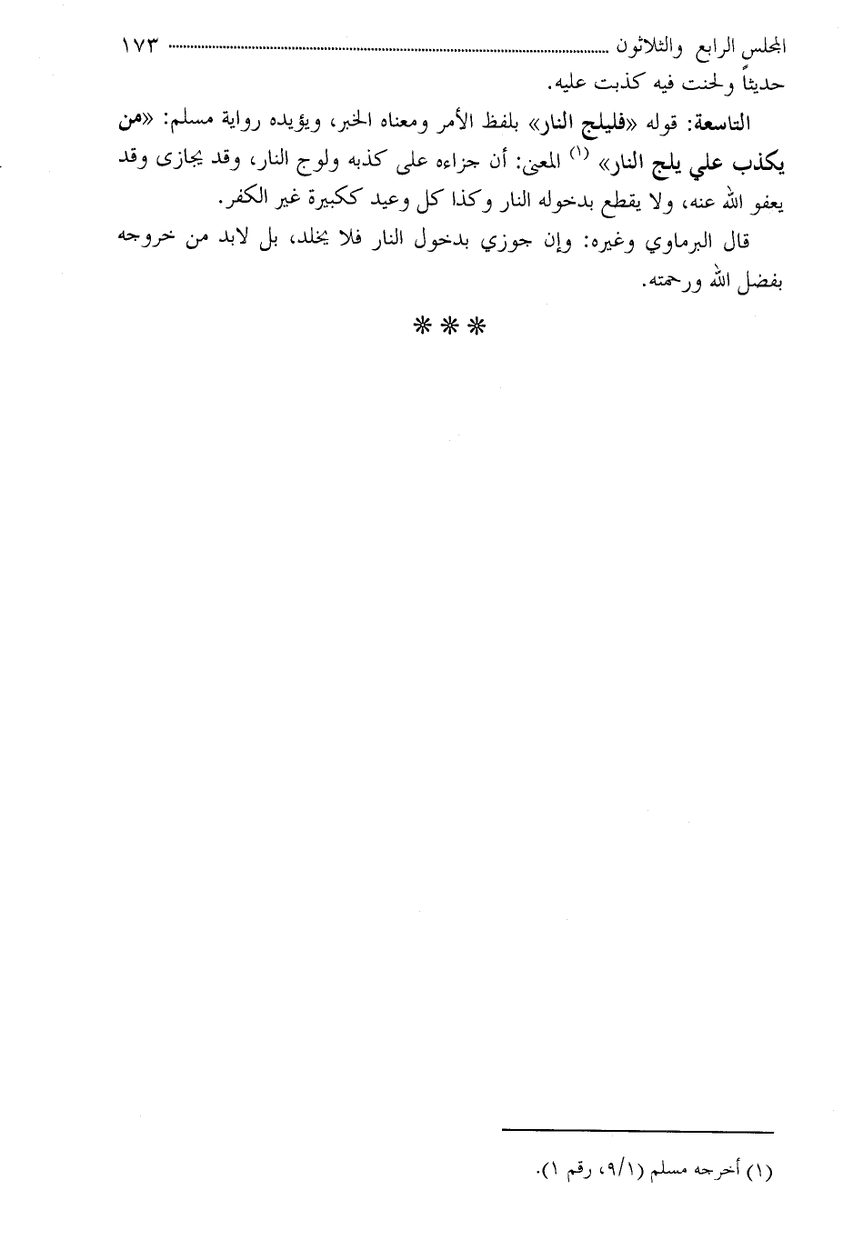 التاسعة: قوله «فليلج النار» بلفظ الأمر ومعناه الخبر، ويؤيده رواية مسلم: «من يكذب علي يلج النار» (¬1) المعنى: أن جزاءه على كذبه ولوج النار، وقد يجازى وقد يعفو الله عنه، ولا يقطع بدخوله النار وكذا كل وعيد ككبيرة غير الكفر.