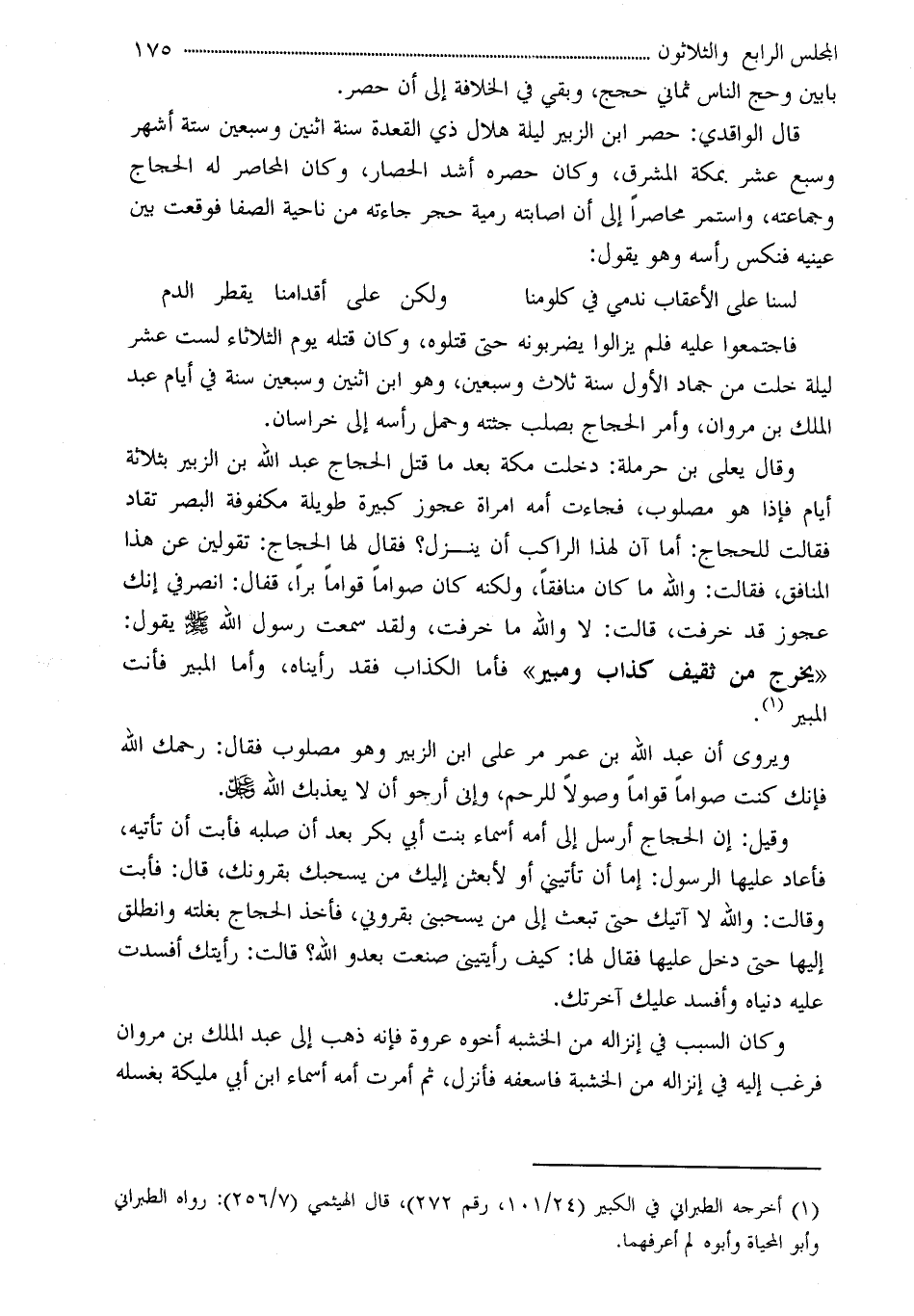 وقال يعلى بن حرملة: دخلت مكة بعد ما قتل الحجاج عبد الله بن الزبير بثلاثة أيام فإذا هو مصلوب، فجاءت أمه امراة عجوز كبيرة طويلة مكفوفة البصر تقاد فقالت للحجاج: أما آن لهذا الراكب أن ينزل؟ فقال لها الحجاج: تقولين عن هذا المنافق، فقالت: والله ما كان منافقاً، ولكنه كان صواماً قواماً براً، قفال: انصرفي إنك عجوز قد خرفت، قالت: لا والله ما خرفت، ولقد سمعت رسول الله - صلى الله عليه وسلم - يقول: «يخرج من ثقيف كذاب ومبير» فأما الكذاب فقد رأيناه، وأما المبير فأنت المبير (¬1) .