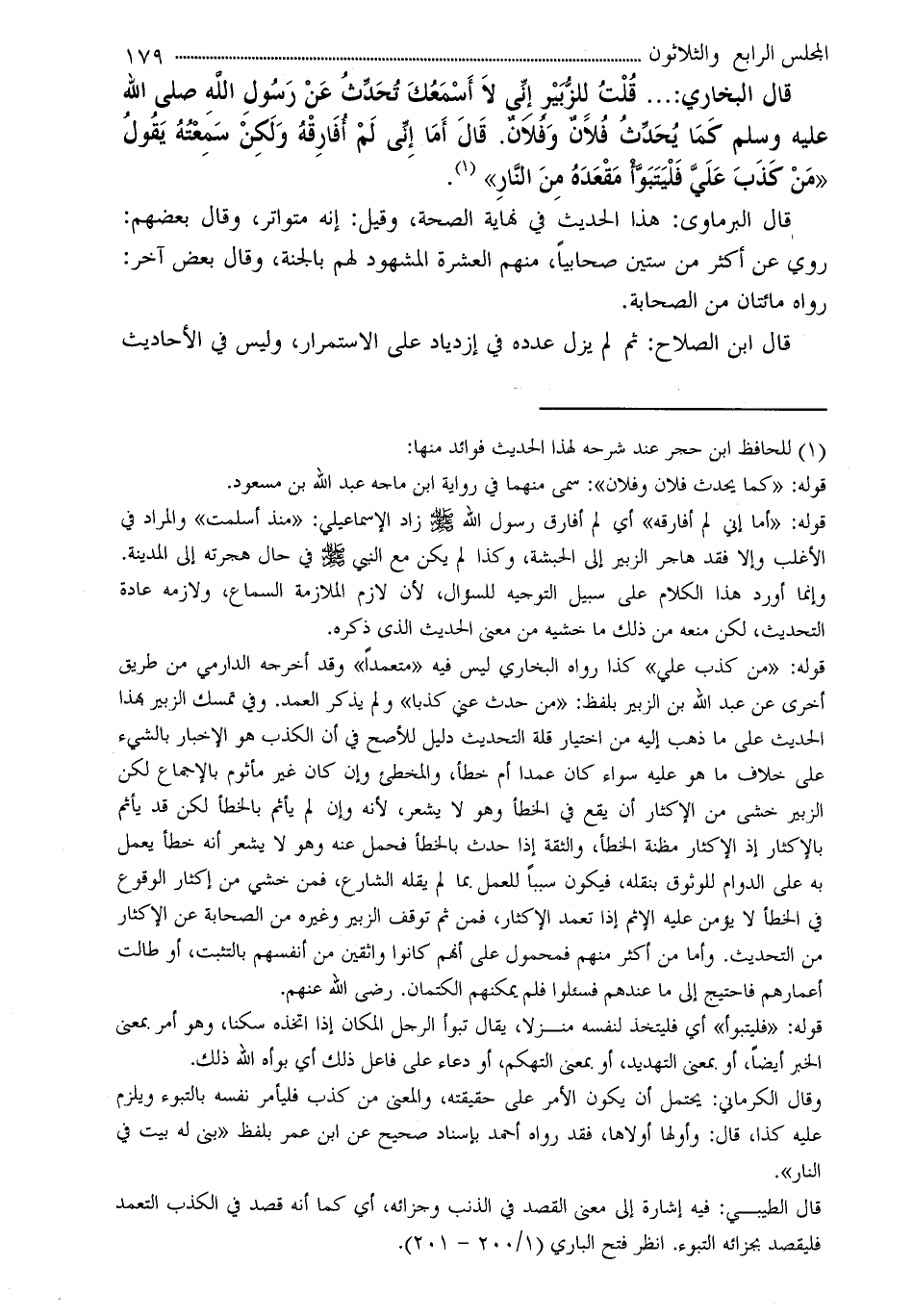 « ... قُلْتُ لِلزُّبَيْرِ إِنِّى لاَ أَسْمَعُكَ تُحَدِّثُ عَنْ رَسُولِ اللَّهِ صلى الله عليه وسلم كَمَا يُحَدِّثُ فُلاَنٌ وَفُلاَنٌ. قَالَ أَمَا إِنِّى لَمْ أُفَارِقْهُ وَلَكِنْ سَمِعْتُهُ يَقُولُ «مَنْ كَذَبَ عَلَيَّ فَلْيَتَبَوَّأْ مَقْعَدَهُ مِنَ النَّارِ» (¬1) .