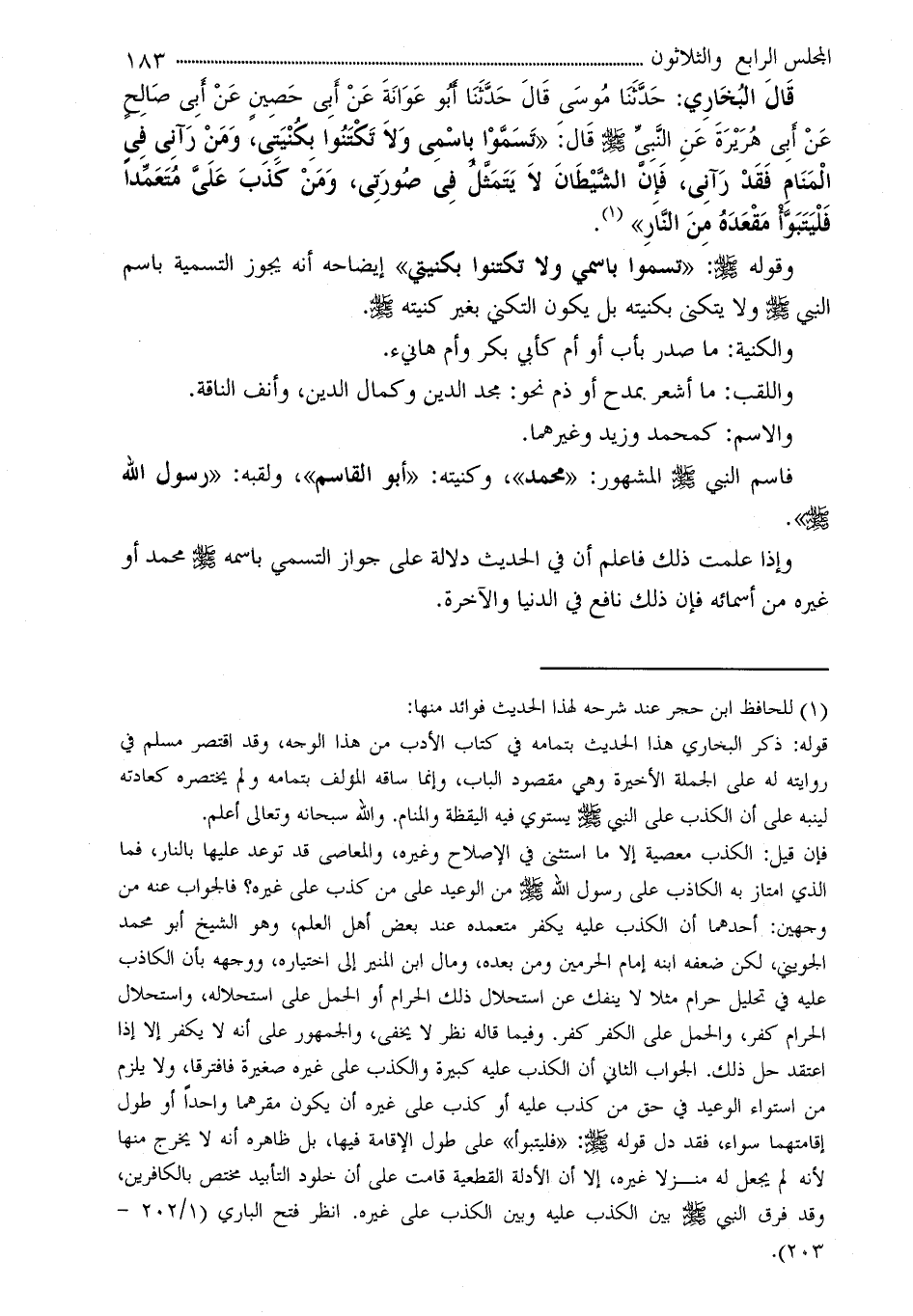 قَالَ البُخَارِي: حَدَّثَنَا مُوسَى قَالَ حَدَّثَنَا أَبُو عَوَانَةَ عَنْ أَبِى حَصِينٍ عَنْ أَبِى صَالِحٍ عَنْ أَبِى هُرَيْرَةَ عَنِ النَّبِىِّ - صلى الله عليه وسلم - قَال: َ «تَسَمَّوْا بِاسْمِى وَلاَ تَكْتَنُوا بِكُنْيَتِى، وَمَنْ رَآنِى فِى الْمَنَامِ فَقَدْ رَآنِى، فَإِنَّ الشَّيْطَانَ لاَ يَتَمَثَّلُ فِى صُورَتِى، وَمَنْ كَذَبَ عَلَىَّ مُتَعَمِّداً فَلْيَتَبَوَّأْ مَقْعَدَهُ مِنَ النَّارِ» (¬1) .