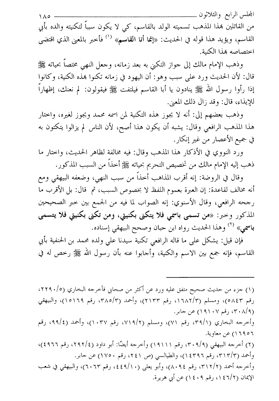 من القائلين بهذا المذهب تسميته الولد بالقاسم، كي لا يكون سبباً لتكنيته والده بأبي القاسم، ويؤيد هذا قوله في الحديث: «إنما أنا القاسم» (¬1) فأخبر بالمعنى الذي اقتضى اختصاصه بهذا الكنية.