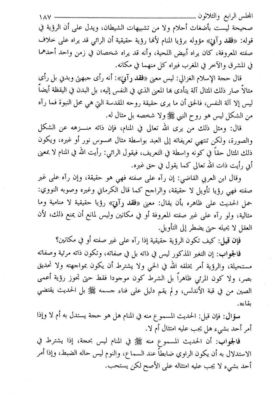 سؤال: فإن قيل: الحديث المسموع منه في المنام هل هو حجة يستدل به أم لا وإذا أمر أحد بشيء هل يجب عليه امتثال أم لا.