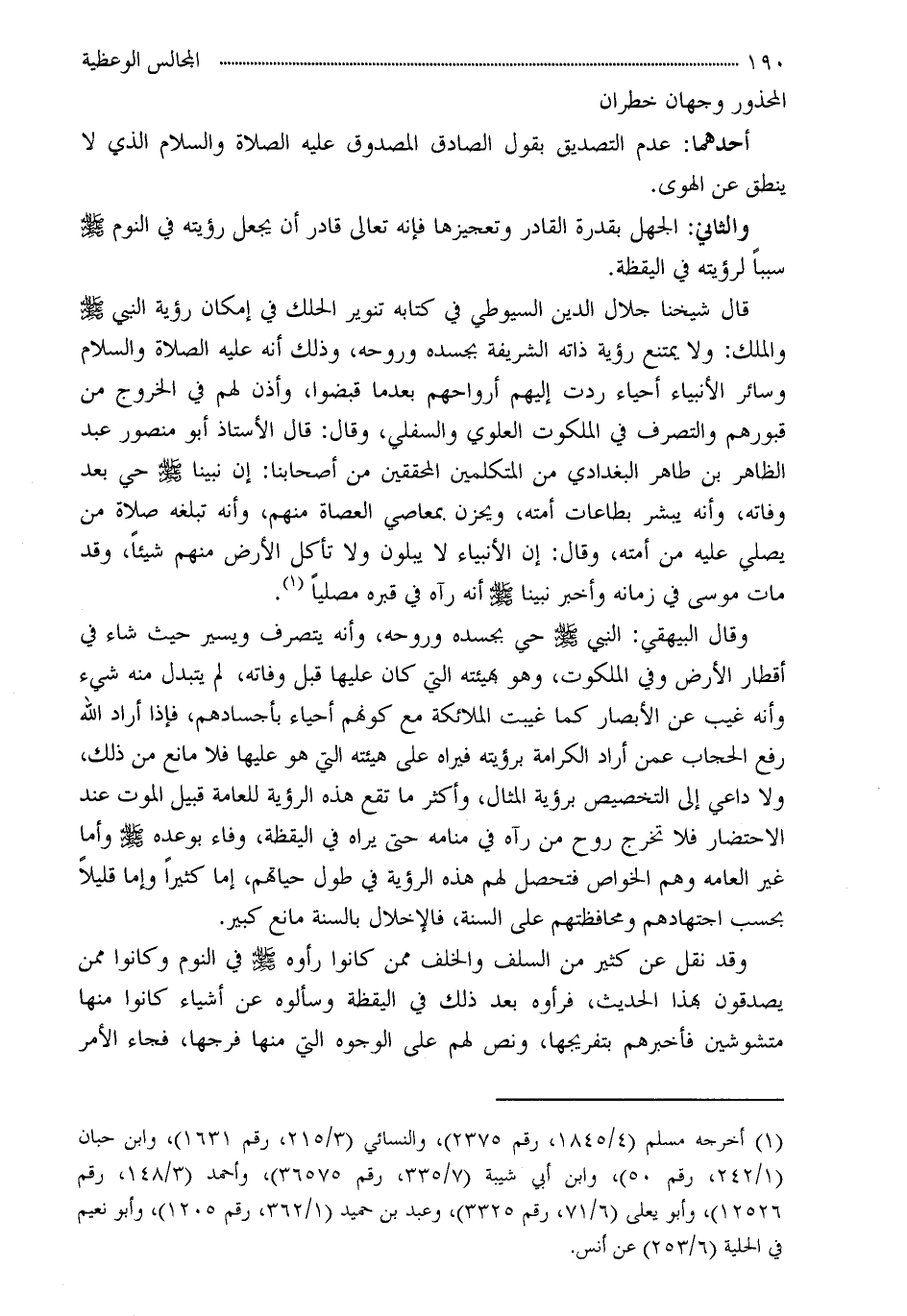 قال شيخنا جلال الدين السيوطي في كتابه تنوير الحلك في إمكان رؤية النبي - صلى الله عليه وسلم - والملك: ولا يمتنع رؤية ذاته الشريفة بجسده وروحة، وذلك أنه عليه الصلاة والسلام وسائر الأنبياء أحياء ردت إليهم أرواحهم بعدما قبضوا، وأذن لهم في الخروج من قبورهم والتصرف في الملكوت العلوي والسفلي، وقال: قال الأستاذ أبو منصور عبد الظاهر بن طاهر البغدادي من المتكلمين المحققين من أصحابنا: إن نبينا - صلى الله عليه وسلم - حي بعد وفاته، وأنه يبشر بطاعات أمته، ويحزن بمعاصي العصاة منهم، وأنه تبلغه صلاة من يصلي عليه من أمته، وقال: إن الأنبياء لا يبلون ولا تأكل الأرض منهم شيئاً، وقد مات موسى في زمانه وأخبر نبينا - صلى الله عليه وسلم - أنه رآه في قبره مصلياً (¬1) .
