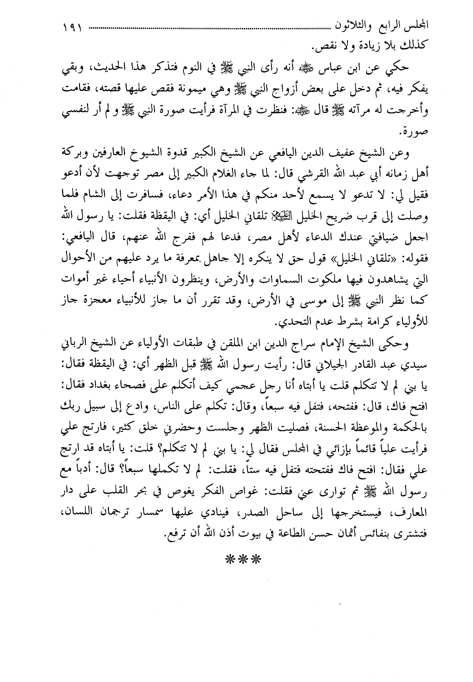 وحكى الشيخ الإمام سراج الدين ابن الملقن في طبقات الأولياء عن الشيخ الرباني سيدي عبد القادر الجيلاني قال: رأيت رسول الله - صلى الله عليه وسلم - قبل الظهر أي: في اليقظة فقال: يا بني لم لا تتكلم قلت يا أبتاه أنا رجل عجمي كيف أتكلم على فصحاء بغداد فقال: افتح فاك، قال: فقتحنه، فتفل فيه سبعاً، وقال: تكلم على الناس، وادع إلى سبيل ربك بالحكمة والموعظة الحسنة، فصليت الظهر وجلست وحضرني خلق كثير، فارتج علي فرأيت علياً قائماً بإزائي في المجلس فقال لي: يا بني لم لا تتكلم؟ قلت: يا أبتاه قد ارتج علي فقال: افتح فاك ففتحته فتفل فيه ستاً، فقلت: لم لا تكملها سبعاً؟ قال: أدباً مع رسول الله - صلى الله عليه وسلم - ثم توارى عني فقلت: غواص الفكر يغوص في بحر القلب على دار المعارف، فيستخرجها إلى ساحل الصدر، فينادي عليها سمسار ترجمان اللسان، فتشترى بنفائس أثمان حسن الطاعة في بيوت أذن الله أن ترفع.