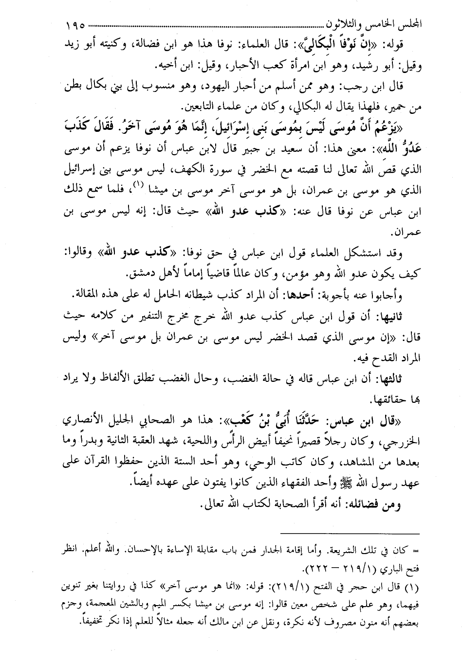 «يَزْعُمُ أَنَّ مُوسَى لَيْسَ بِمُوسَى بَنِى إِسْرَائِيلَ، إِنَّمَا هُوَ مُوسَى آخَرُ. فَقَالَ كَذَبَ عَدُوُّ اللَّهِ» : معنى هذا: أن سعيد بن جبير قال لابن عباس أن نوفا يزعم أن موسى الذي قص الله تعالى لنا قصته مع الخضر في سورة الكهف، ليس موسى بنى إسرائيل الذي هو موسى بن عمران، بل هو موسى آخر موسى بن ميشا (¬1) ، فلما سمع ذلك ابن عباس عن نوفا قال عنه: «كذب عدو الله» حيث قال: إنه ليس موسى بن عمران.