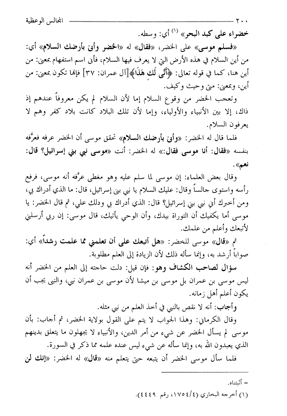 فلما قال له الخضر: «وأنى بأرضك السلام» تحقق موسى أن الخضر عرفه فعرَّفه بنفسه «فقال: أنا موسى فقال» له الخضر: أنت «موسى نبي بني إسرائيل؟ قال: نعم» .