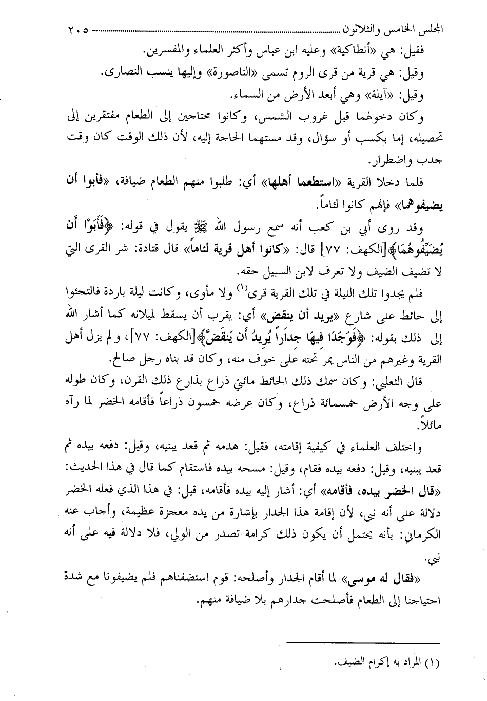 فلم يجدوا تلك الليلة في تلك القرية قرى (¬1) ولا مأوى، وكانت ليلة باردة فالتجئوا إلى حائط على شارع «يريد أن ينقض» أي: يقرب أن يسقط لميلانه كما أشار الله إلى ذلك بقوله: ?فَوَجَدَا فِيهَا جِداَراً يُرِيدُ أَن يَنقَضَّ? [الكهف: 77] ، ولم يزل أهل القرية وغيرهم من الناس يمر تحته على خوف منه، وكان قد بناه رجل صالح.