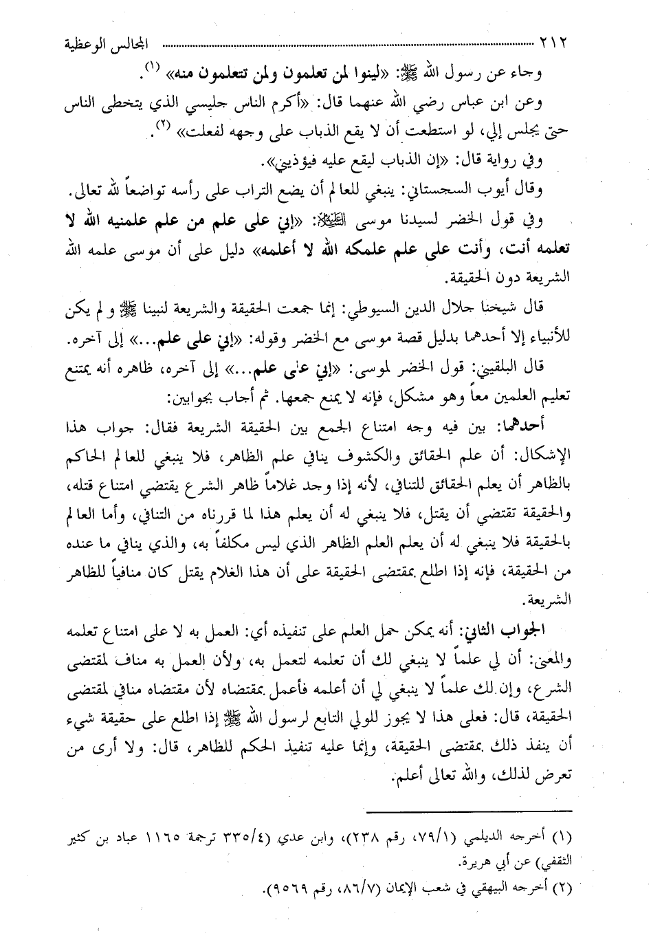 قال البلقيني: قول الخضر لموسى: «إني على علم ... » إلى آخره، ظاهره أنه يمتنع تعليم العلمين معاً وهو مشكل، فإنه لا يمنع جمعها. ثم أجاب بجوابين: