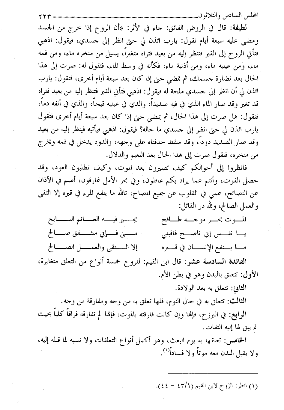 الفائدة السادسة عشر: قال ابن القيم: للروح خمسة أنواع من التعلق متغايرة، الأول: تتعلق بالبدن وهو في بطن الأم.
