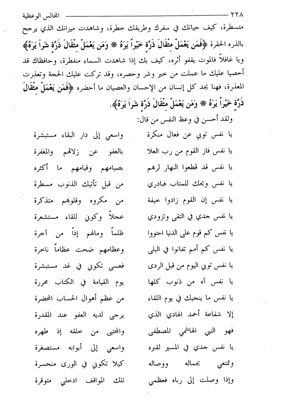 متسطرة، كيف حياتك في سفرك وطريقك خطرة، وشاهدت ميزانك الذي يرجح بالذره الحقرة ?فَمَن يَعْمَلْ مِثْقَالَ ذَرَّةٍ خَيْراً يَرَهُ * وَمَن يَعْمَلْ مِثْقَالَ ذَرَّةٍ شَراًّ يَرَهُ? ويا غافلاً فالموت يقفو أثره، كيف بك إذا شاهدت السماء منفطرة، وحافظاك قد أحصيا عليك ما عملت من خير وشر وحصره، وقد تركت عليك الحجة وتعذرت المعذرة، فهنا يجد كل إنسان من الإحسان والعصيان ما أحضره ?فَمَن يَعْمَلْ مِثْقَالَ ذَرَّةٍ خَيْراً يَرَهُ * وَمَن يَعْمَلْ مِثْقَالَ ذَرَّةٍ شَراًّ يَرَهُ?.