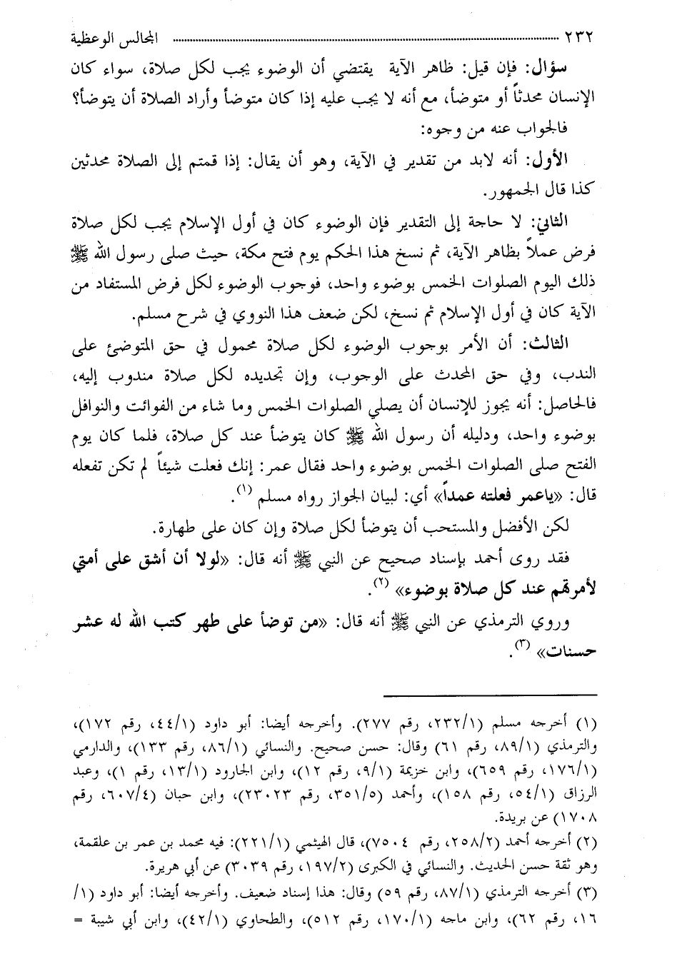 سؤال: فإن قيل: ظاهر الآية يقتضي أن الوضوء يجب لكل صلاة، سواء كان الإنسان محدثاً أو متوضأ، مع إنه لا يجب عليه إذا كان متوضأ وأراد الصلاة أن يتوضأ؟