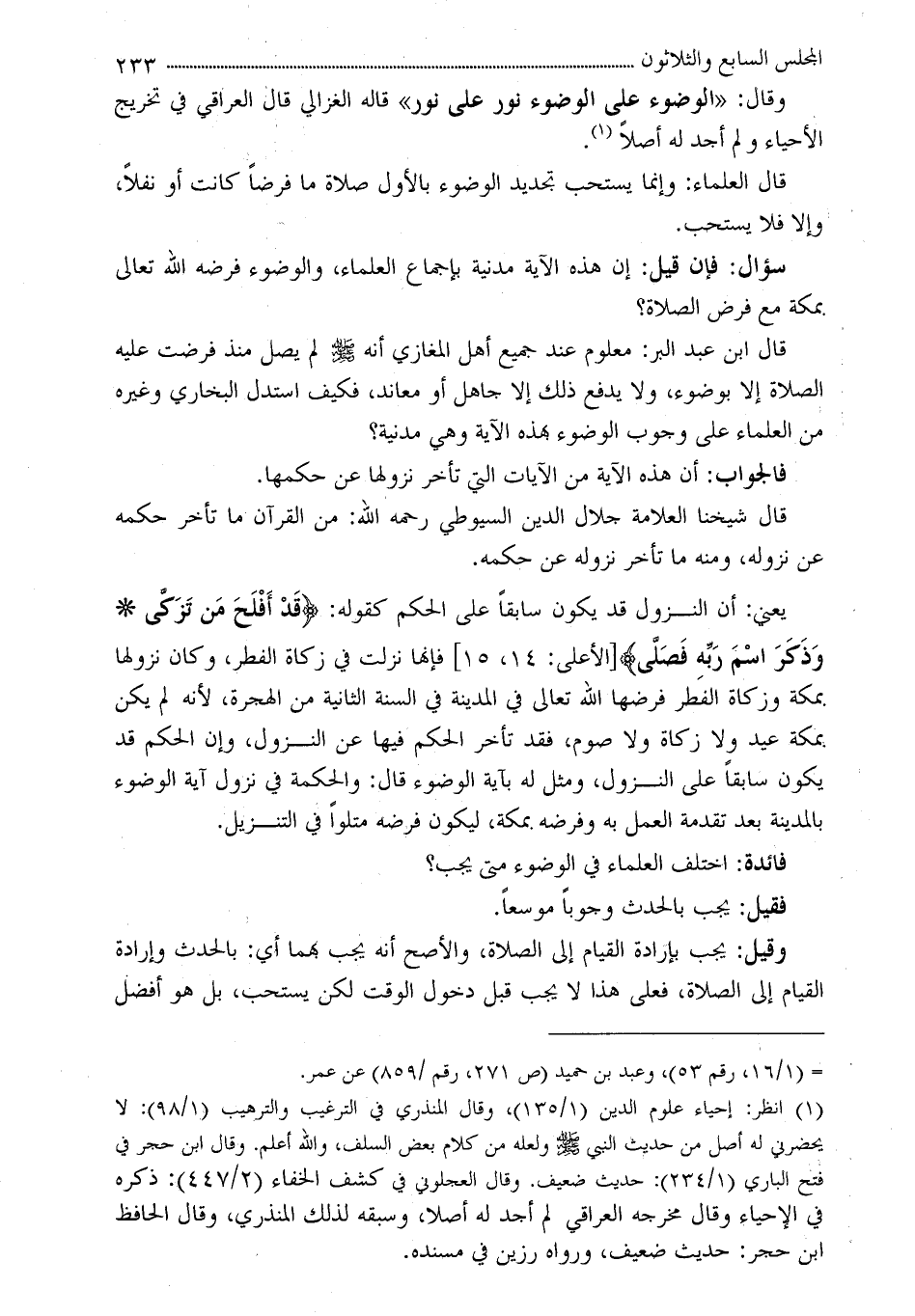 (¬1) انظر: إحياء علوم الدين (1/135) ، وقال المنذري في الترغيب والترهيب (1/98) : لا يحضرني له أصل من حديث النبي - صلى الله عليه وسلم - ولعله من كلام بعض السلف، والله أعلم. وقال ابن حجر في فتح الباري (1/234) : حديث ضعيف. وقال العجلوني في كشف الخفاء (2/447) : ذكره في الإحياء وقال مخرجه العراقي لم أجد له أصلا، وسبقه لذلك المنذري، وقال الحافظ ابن حجر: حديث ضعيف، ورواه رزين في مسنده.