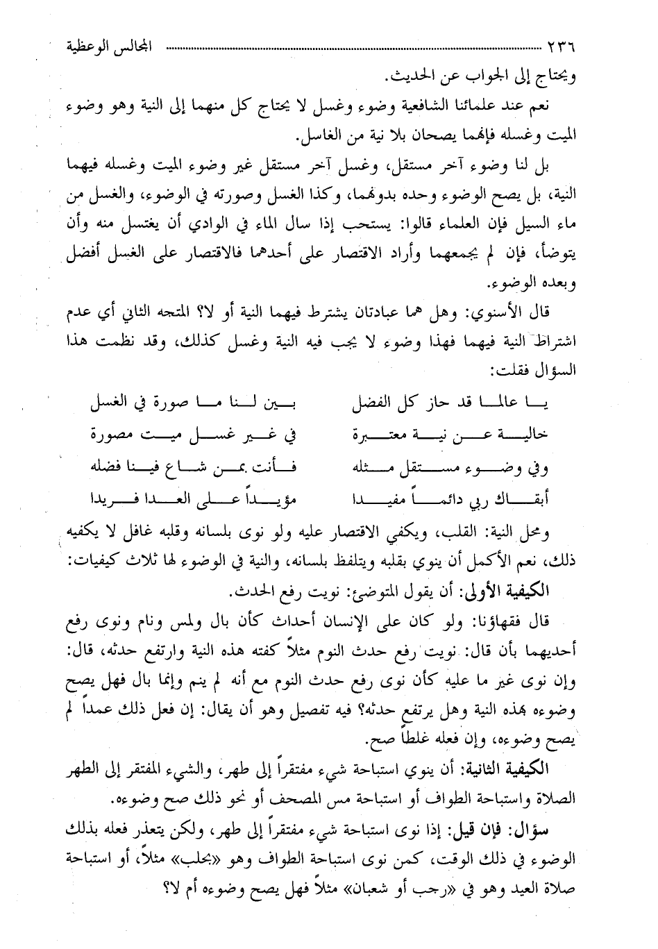 قال الأسنوي: وهل هما عبادتان يشترط فيهما النية أو لا؟ المتجه الثاني أي عدم اشتراط النية فيهما فهذا وضوء لا يجب فيه النية وغسل كذلك، وقد نظمت هذا السؤال فقلت: