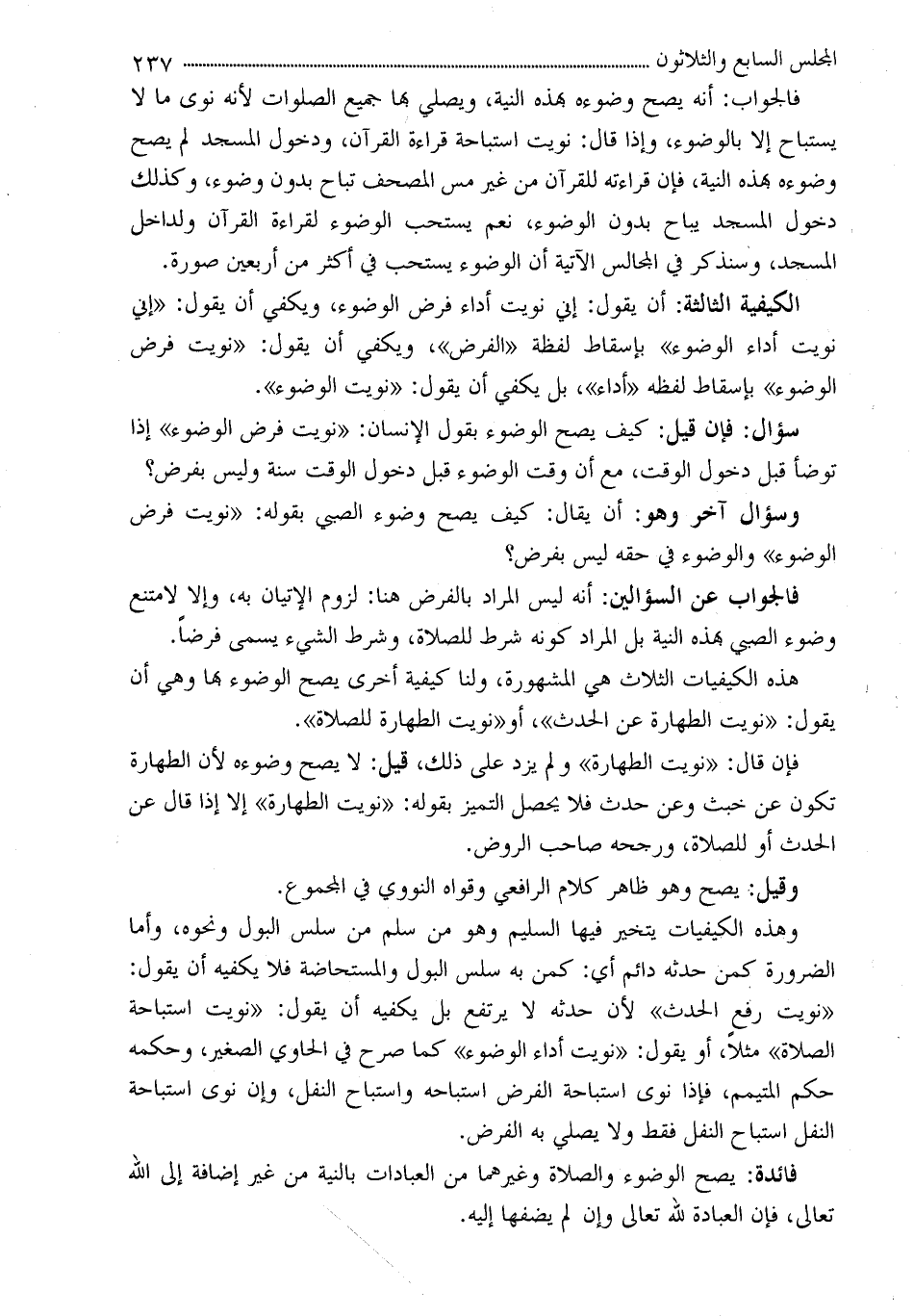 فالجواب: أنه يصح وضوءه بهذه النية، ويصلي بها جميع الصلوات لأنه نوى ما لا يستباح إلا بالوضوء، وإذا قال: نويت استباحة قراءة القرآن، ودخول المسجد لم يصح وضوءه بهذه النية، فإن قرأته للقران من غير مس المصحف تباح بدون وضوء، وكذلك دخول المسجد يباح بدون الوضوء، نعم يستحب الوضوء لقراءة القرآن ولداخل المسجد، وسنذكر في المجالس الآتية أن الوضوء يستحب في أكثر من أربعين صورة.