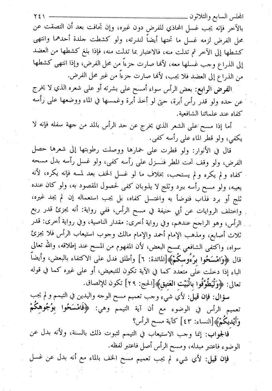 سؤال: فإن قيل: لأي شيء وجب تعميم مسح الوجه واليدين في التيمم ولم يجب تعميم الرأس في الوضوء مع أن آية التيمم وهي: ?فَامْسَحُوا بِوُجُوهِكُمْ وَأَيْدِيكُمْ? [النساء: 43] كآية مسح الرأس؟