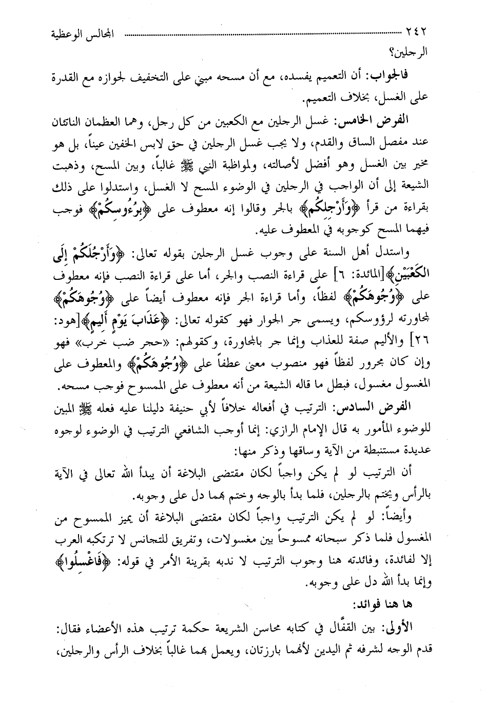 الفرض الخامس: غسل الرجلين مع الكعبين من كل رجل، وهما العظمان الناتئان عند مفصل الساق والقدم، ولا يجب غسل الرجلين في حق لابس الخفين عيناً، بل هو مخير بين الغسل وهو أفضل لأصالته، ولمواظبة النبي - صلى الله عليه وسلم - غالباً، وبين المسح، وذهبت الشيعة إلى أن الواجب في الرجلين في الوضوء المسح لا الغسل، واستدلوا على ذلك بقرأة من قرأ ?وَأَرْجِلِكُم? بالجر وقالوا أنه معطوف على ?بِرُءُوسِكُمْ? فوجب فيهما المسح كوجوبه في المعطوف عليه.