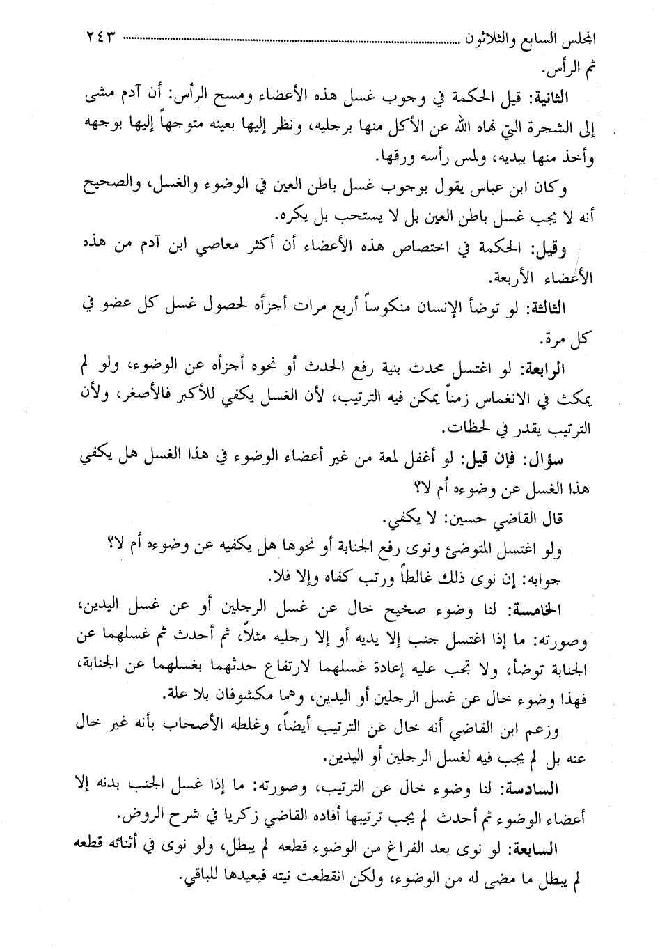 السادسة: لنا وضوء خال عن الترتيب، وصورته: ما إذا غسل الجنب بدنه إلا أعضاء الوضوء ثم أحدث لم يجب ترتيبها أفاده القاضي زكريا في شرح الروض.