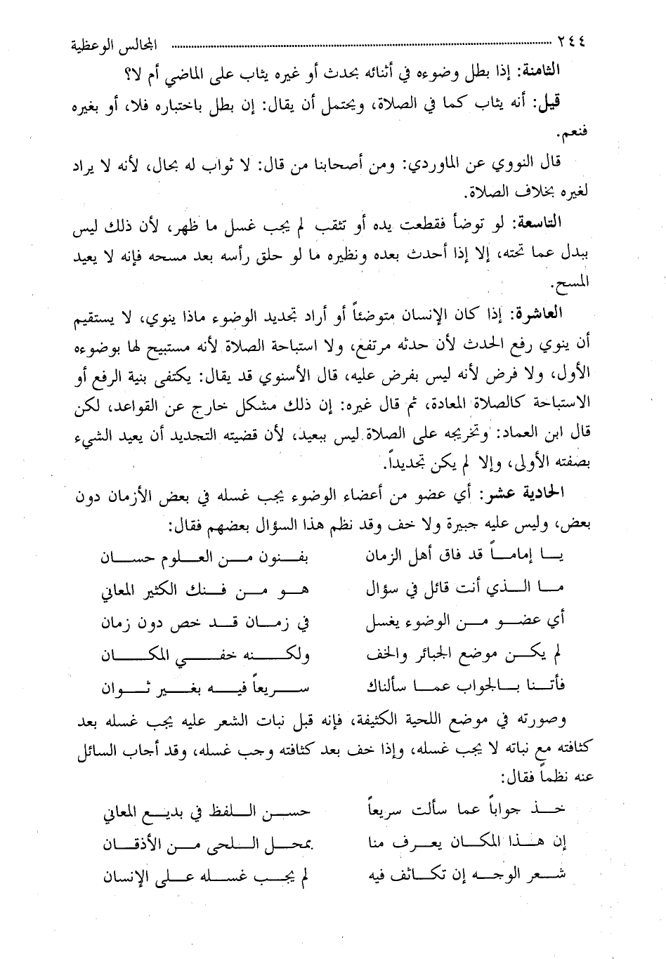 الحادية عشر: أي عضو من أعضاء الوضوء يجب غسله في بعض الأزمان دون بعض، وليس عليه جبيرة ولا خف وقد نظم هذا السؤال بعضهم فقال: