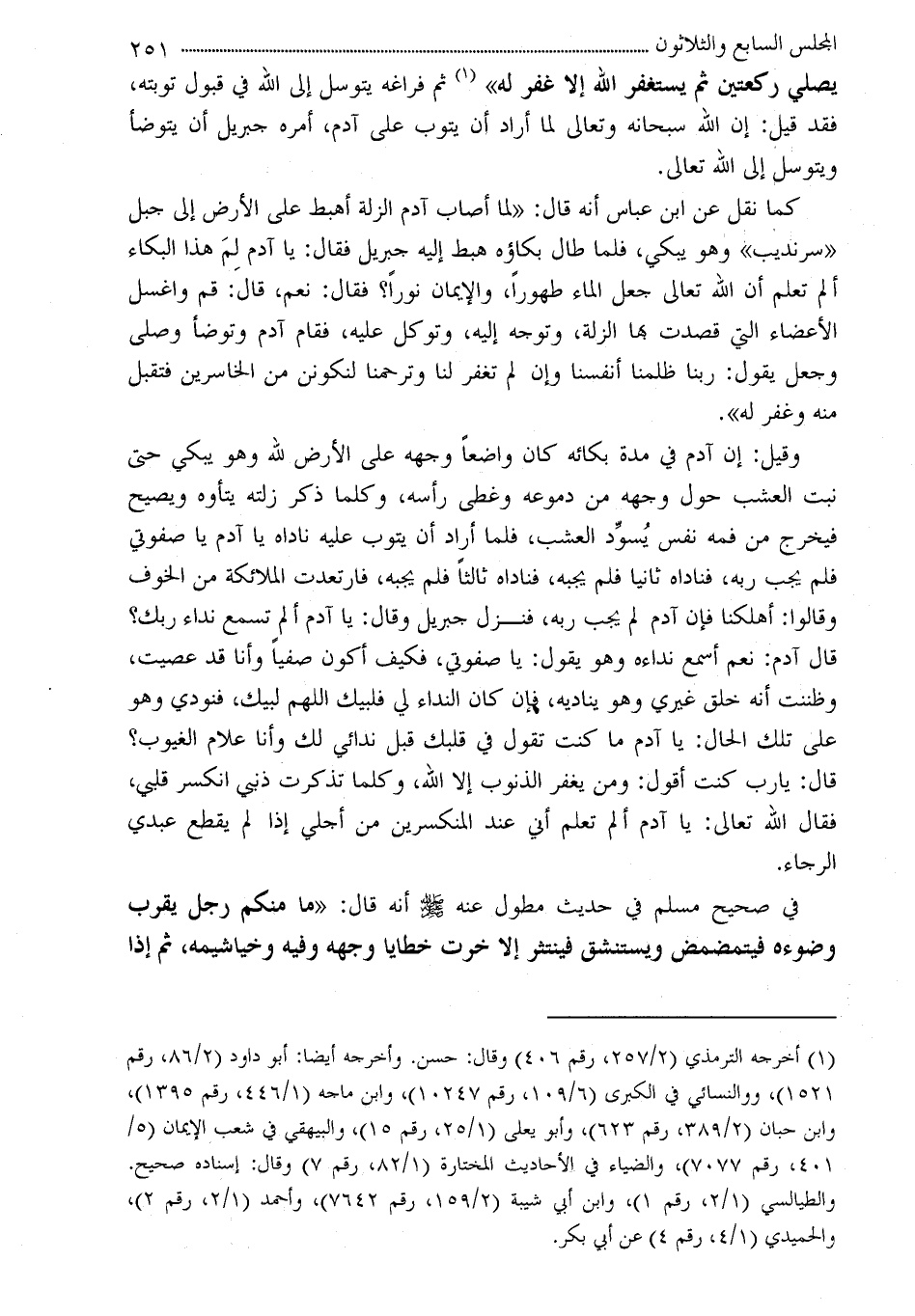 كما نقل عن ابن عباس أنه قال: «لما أصاب آدم الزلة أهبط على الأرض إلى جبل «سرنديب» وهو يبكي، فلما طال بكاؤه وهبط إليه جبريل فقال: يا آدم كم هذا البكاء ألم تعلم أن الله تعالى جعل الماء طهوراً، والإيمان نوراً؟ فقال: نعم، قال: قم واغسل الأعضاء التي قصدت بها الزلة، وتوجه إليه، وتوكل عليه، فقام آدم وتوضأ وصلي وجعل يقول: ربنا ظلمنا أنفسنا وإن لم تغفر لنا وترحمنا لنكونن من الخاسرين فتقبل منه وغفر له» .