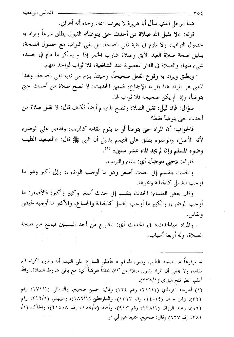 فالجواب: أن المراد حتى يتوضأ أو ما يقوم مقامه كالتيمم، واقتصر على الوضوء لأنه الأصل، والوضوء يطلق على التيمم بدليل أن النبي - صلى الله عليه وسلم - قال: «الصعيد الطيب وضوء المسلم وإن لم يجد الماء عشر سنين» (¬1) .
