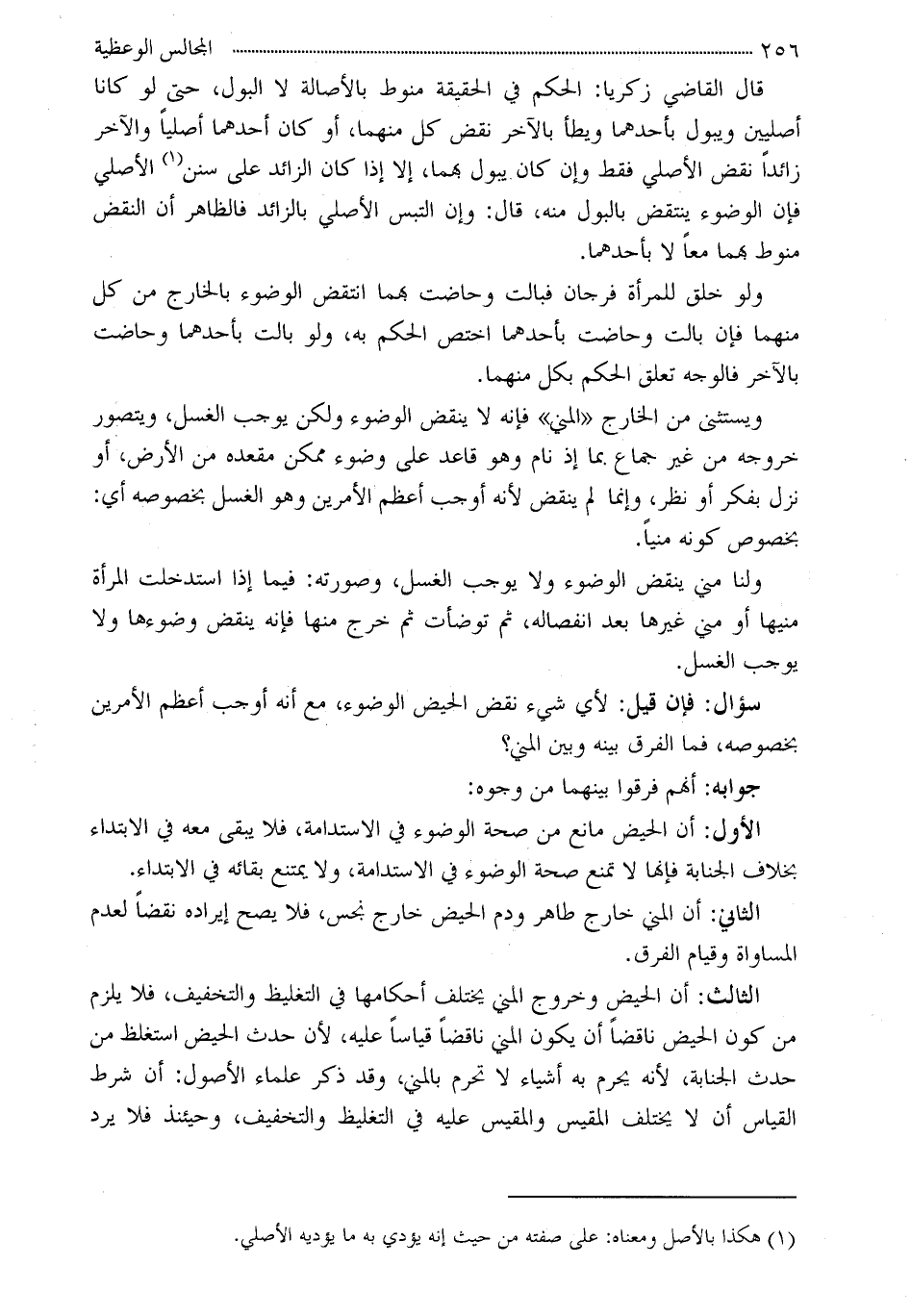 سؤال: فإن قيل: لأي شيء نقض الحيض الوضوء، مع أنه أوجب أعظم الأمرين بخصوصه، فما الفرق بينه وبين المني؟