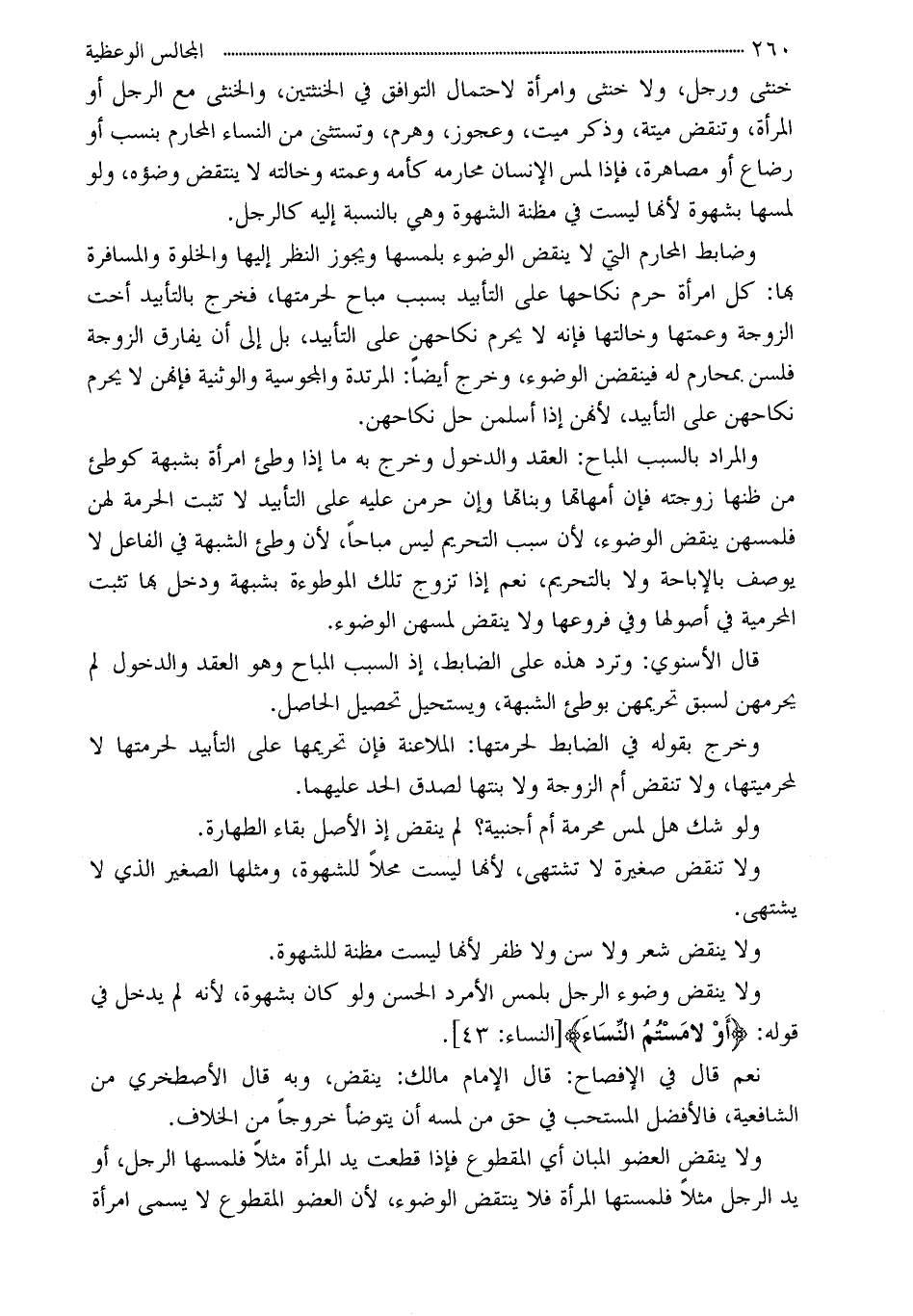 وضابط المحارم التي لا ينقض الوضوء بلمسها ويجوز النظر إليها والخلوة والمسافرة بها: كل امرأة حرم نكاحها على التأبيد بسبب مباح لحرمتها، فخرج بالتأبيد أخت الزوجة وعمتها وخالتها فإنه لا يحرم نكاحهن على التأبيد، بل إلى أن يفارق الزوجة فلسن بمحارم له فينقضن الوضوء، وخرج أيضاً: المرتدة والمجوسية والوثنية فإنهن لا يحرم نكاحهن على التأبيد، لأنهن إذا أسلمن حل نكاحهن.