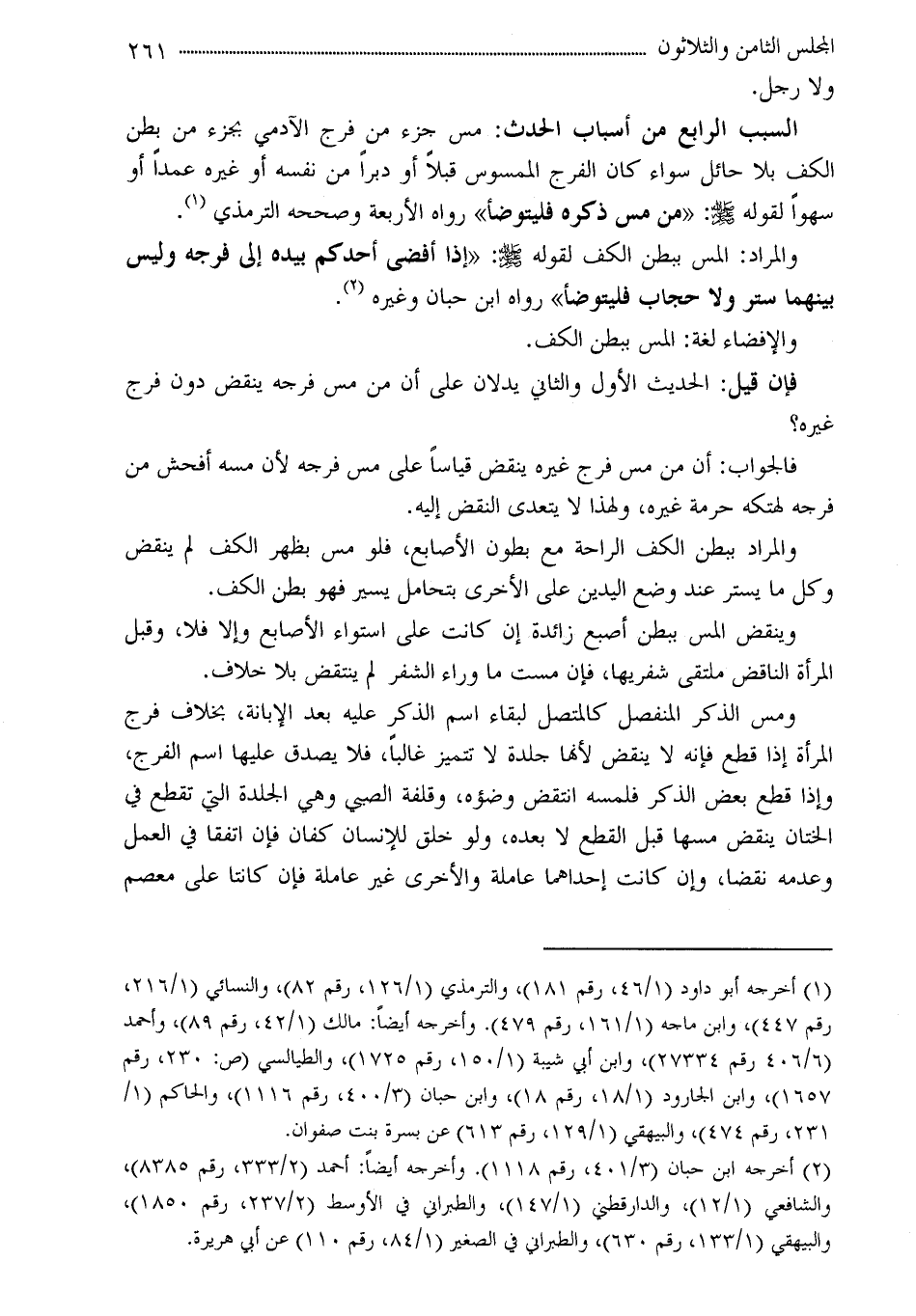 والمراد: المس ببطن الكف لقوله - صلى الله عليه وسلم -: «إذا أفضى أحدكم بيده إلى فرجه وليس بينهما ستر ولا حجاب فليتوضأ» رواه ابن حبان وغيره (¬2) .
