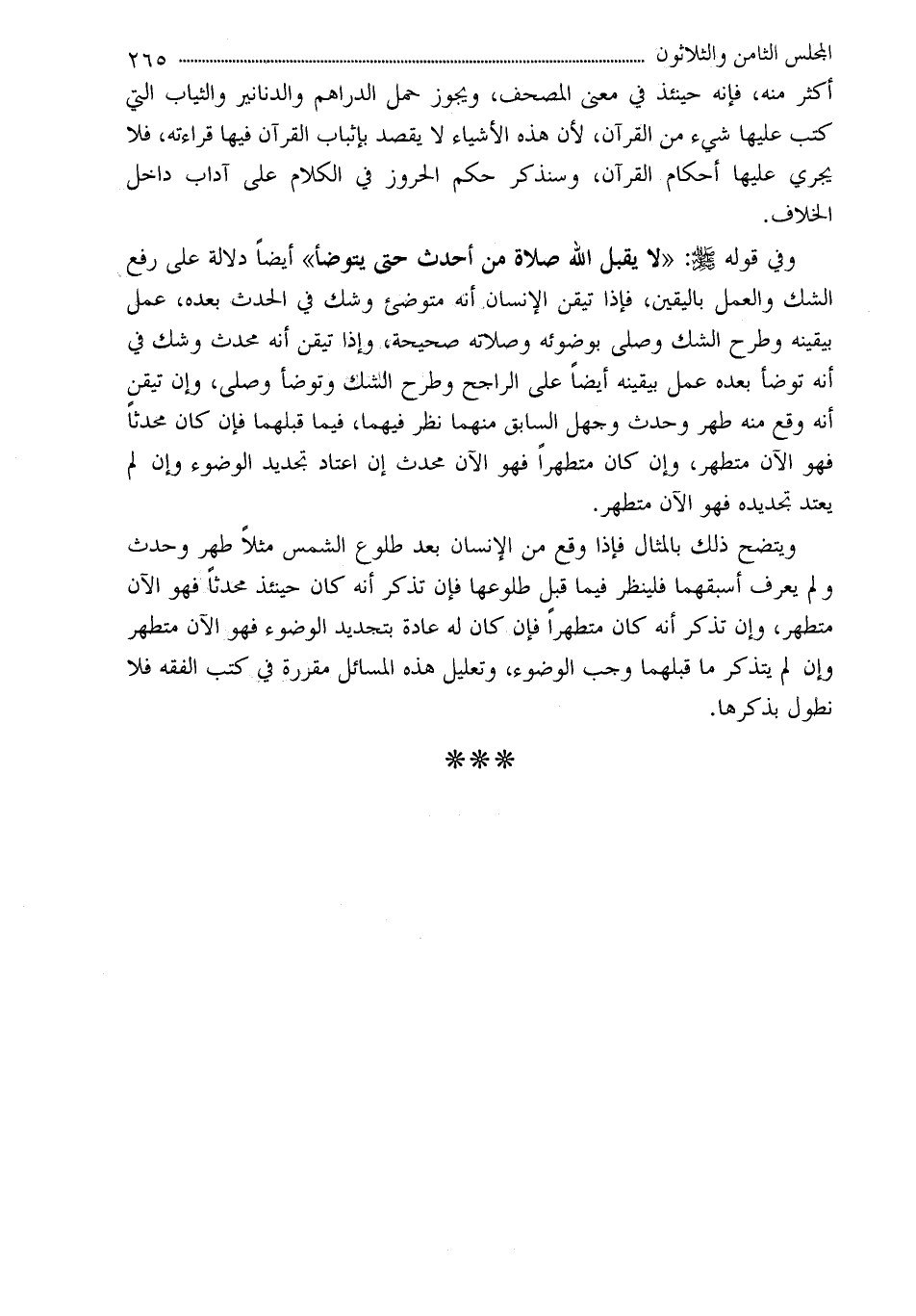 وفي قوله - صلى الله عليه وسلم -: «لا يقبل الله صلاة من أحدث حتى يتوضأ» أيضاً دلالة على رفع الشك والعمل باليقين، فإذا تيقن الإنسان أنه متوضئ وشك في الحدث بعده، عمل بيقينه وطرح الشك وصلى بوضوئه وصلاته صحيحة، وإذا تيقن أنه محدث وشك في أنه توضأ بعده عمل بيقينه أيضاً على الراجح وطرح الشك وتوضأ وصلى، وإن تيقن أنه وقع منه طهر وحدث وجهل السابق منهما نظر فيهما، فيما قبلهما فإن كان محدثاً فهو الآن متطهر، وإن كان متطهراً فهو الآن محدث إن اعتاد تجديد الوضوء وإن لم يعتد تجديده فهو الآن متطهر.