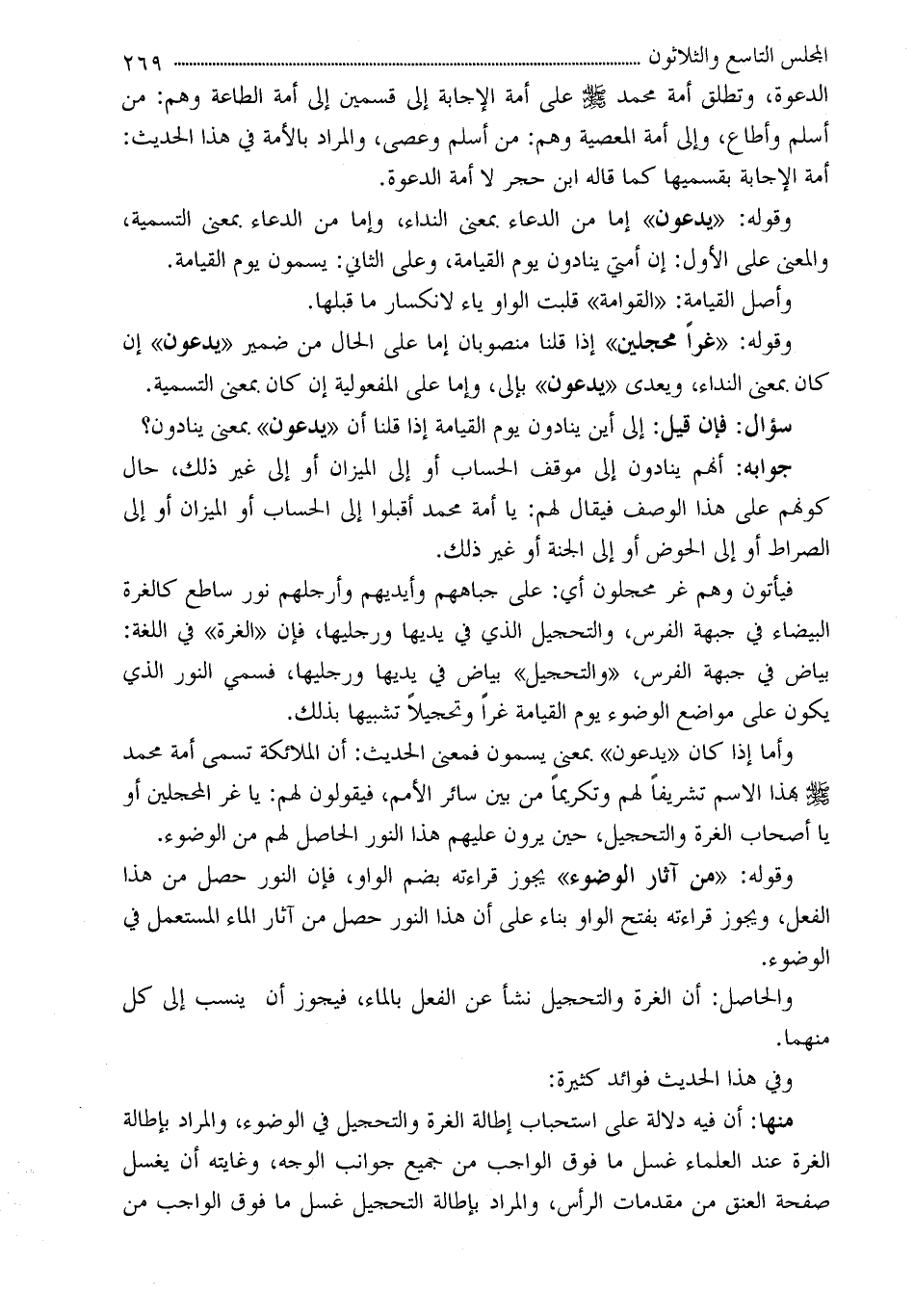 وأما إذا كان «يدعون» بمعنى يسمون فمعنى الحديث: أن الملائكة تسمي أمة محمد - صلى الله عليه وسلم - بهذا الاسم تشريفاً لهم وتكريماً من بين سائر الأمم، فيقولون لهم: يا غر المحجلين أو يا أصحاب الغرة والتحجيل، حين يرون عليهم هذا النور الحاصل لهم من الوضوء.
