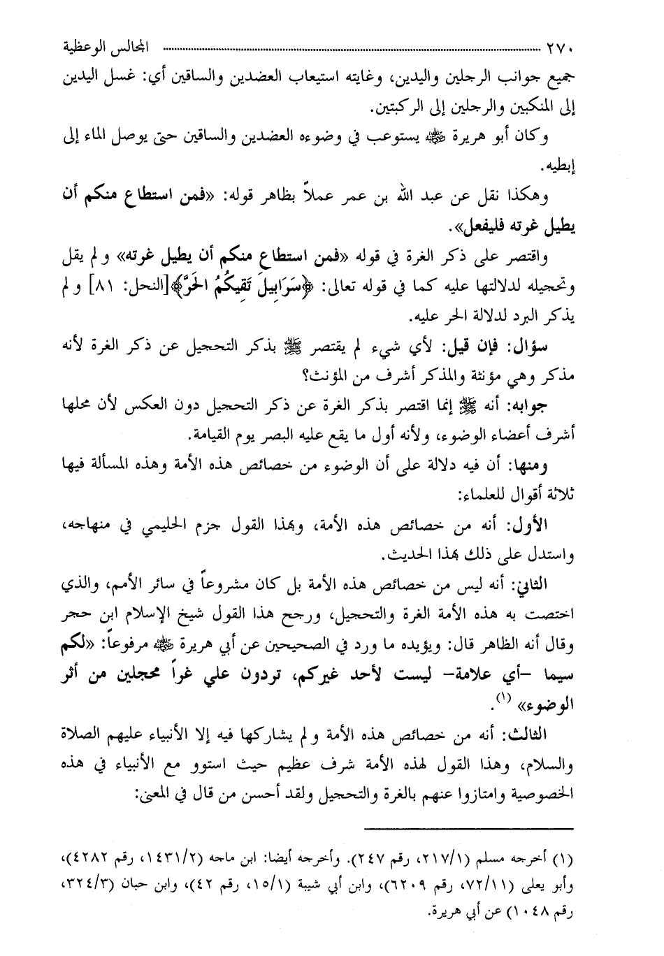 الثاني: أنه ليس من خصائص هذه الأمة بل كان مشروعاً في سائر الأمم، والذي اختصت به هذه الأمة الغرة والتحجيل، ورجح هذا القول شيخ الإسلام ابن حجر وقال أنه الظاهر قال: ويؤيده ما ورد في الصحيحين عن أبي هريرة - رضي الله عنه - مرفوعاً: «لكم سيما -أي علامة- ليست لأحد غيركم، تردون علي غراً محجلين من أثر الوضوء» (¬1) .