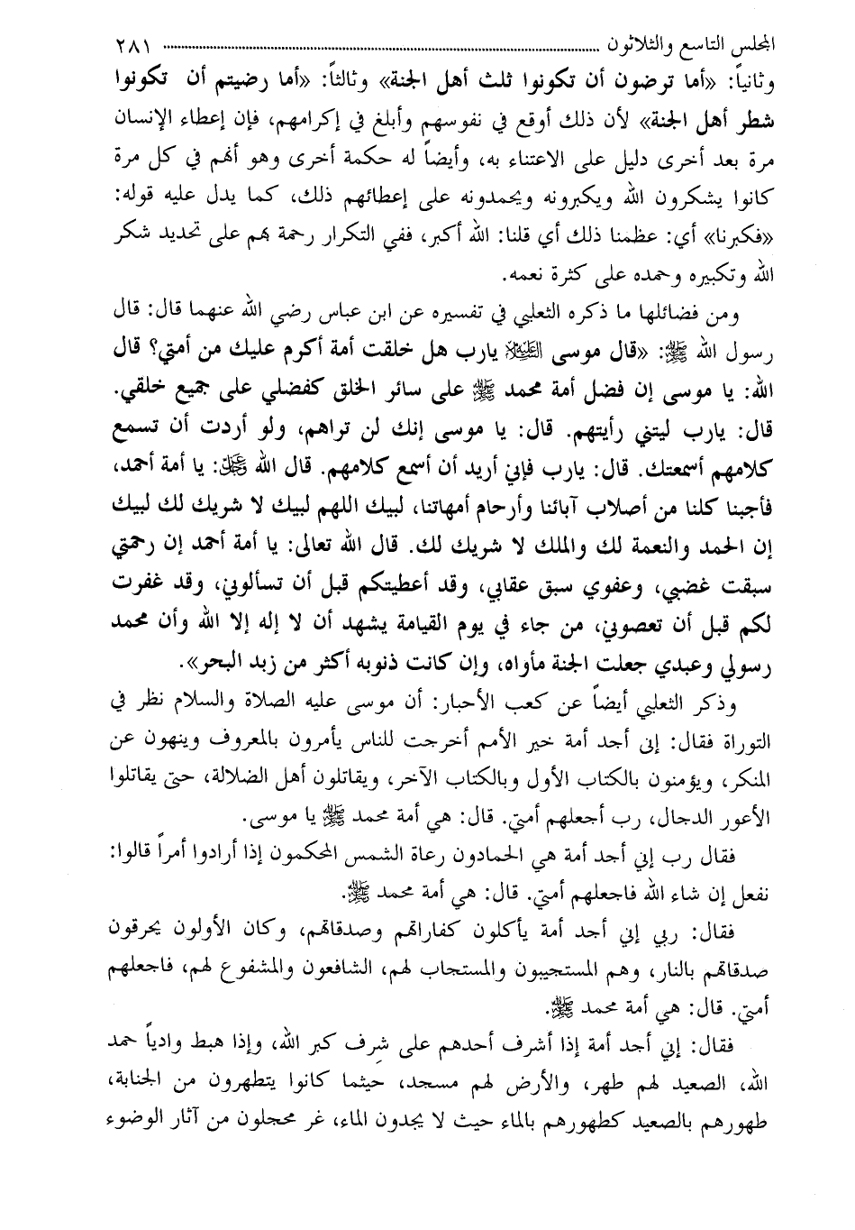 ومن فضائلها ما ذكره الثعلبي في تفسيره عن ابن عباس رضي الله عنهما قال: قال رسول الله - صلى الله عليه وسلم -: «قال موسى - عليه السلام - يارب هل خلقت أمة أكرم عليك من أمتي؟ قال الله: يا موسى إن فضل أمة محمد - صلى الله عليه وسلم - على سائر الخلق كفضلي على جميع خلقي. قال: يارب ليتني رأيتهم. قال: يا موسى إنك لن تراهم، ولو أردت أن تسمع كلامهم أسمعتك. قال: يارب فإني أريد أن أسمع كلامهم. قال الله - عز وجل -: يا أمة أحمد، فأجبنا كلنا من أصلاب آبائنا وأرحام أمهاتنا، لبيك اللهم لبيك لا شريك لك لبيك إن الحمد والنعمة لك والملك لا شريك لك. قال الله تعالى: يا أمة أحمد إن رحمتي سبقت غضبي، وعفوي سبق عقابي، وقد أعطيتكم قبل أن تسألوني، وقد غفرت لكم قبل أن تعصوني، من جاء في يوم القيامة يشهد أن لا إله إلا الله وأن محمد رسولي وعبدي جعلت الجنة مأواه، وإن كانت ذنوبه أكثر من زبد البحر» .