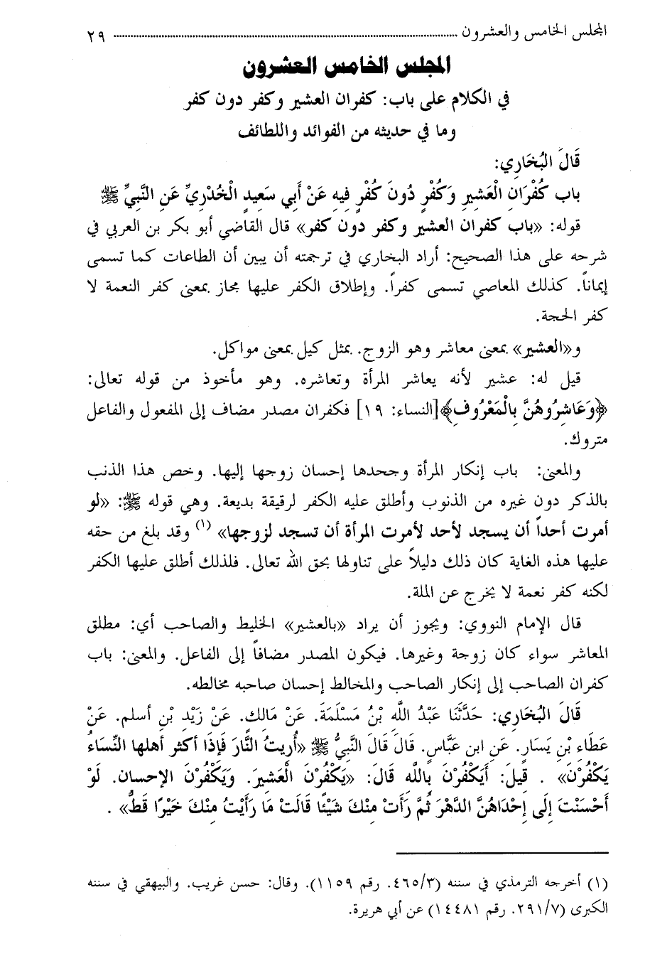 قوله: «باب كفران العشير وكفر دون كفر» قال القاضي أبو بكر بن العربي في شرحه على هذا الصحيح: أراد البخاري في ترجمته أن يبين أن الطاعات كما تسمى إيماناً. كذلك المعاصي تسمى كفراً. وإطلاق الكفر عليها مجاز بمعنى كفر النعمة لا كفر الحجة.
