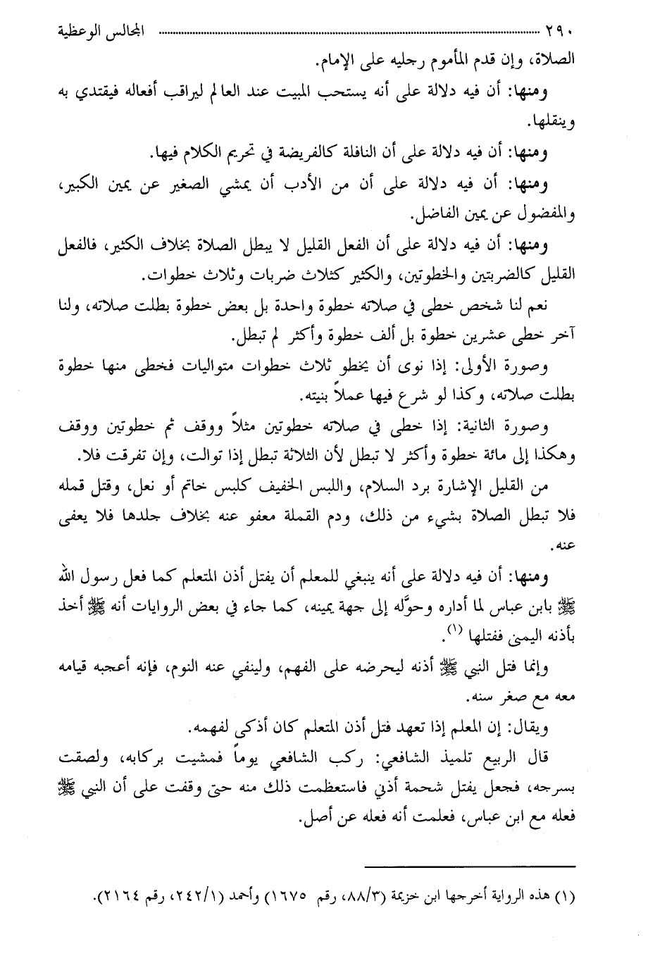 ومنها: أن فيه دلالة على أنه ينبغي للمعلم أن يفتل أذن المتعلم كما فعل رسول الله - صلى الله عليه وسلم - بابن عباس لما أداره وحوَّلة إلى جهة يمينه، كما جاء في بعض الروايات أنه - صلى الله عليه وسلم - أخذ بأذنه اليمنى ففتلها (¬1) .
