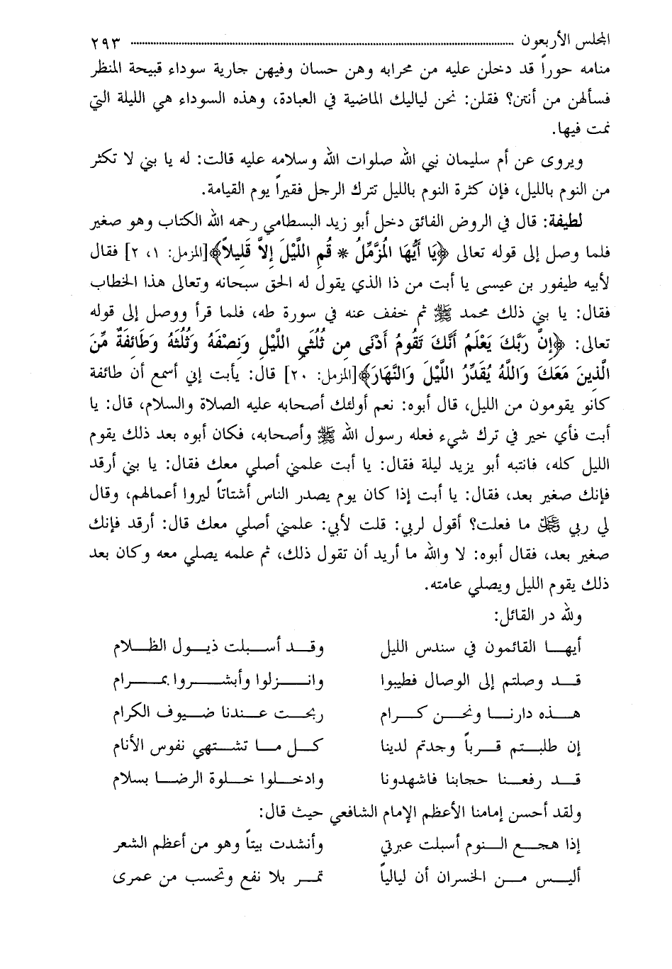 لطيفة: قال في الروض الفائق دخل أبو زيد البسطامي رحمه الكتاب وهو صغير فلما وصل إلى قوله تعالى ?يَا أَيُّهَا المُزَّمِّلُ * قُمِ اللَّيْلَ إِلاَّ قَلِيلاً? [المزمل: 1، 2] فقال لأبيه طيفور بن عيسى يا أبت من ذا الذي يقول له الحق سبحانه وتعالى هذا الخطاب فقال: يا بني ذلك محمد - صلى الله عليه وسلم - ثم خفف عنه في سورة طه، فلما قرأ ووصل إلى قوله تعالى: ?إِنَّ رَبَّكَ يَعْلَمُ أَنَّكَ تَقُومُ أَدْنَى مِن ثُلُثَيِ اللَّيْلِ وَنِصْفَهُ وَثُلُثَهُ وَطَائِفَةٌ مِّنَ الَّذِينَ مَعَكَ وَاللَّهُ يُقَدِّرُ اللَّيْلَ وَالنَّهَارَ? [المزمل: 20] قال: يأبت إني أسمع أن طائفة كانو يقومون من الليل، قال أبوه: نعم أولئك أصحابه عليه الصلاة والسلام، قال: يا أبت فأي خير في ترك شيء فعله رسول الله - صلى الله عليه وسلم - وأصحابه، فكان أبوه بعد ذلك يقوم الليل كله، فانتبه أبو يزيد ليلة فقال: يا أبت علمني أصلي معك فقال: يا بني أرقد فإنك صغير بعد، فقال: يا أبت إذا كان يوم يصدر الناس أشتاتاً ليروا أعمالهم، وقال لي ربي - عز وجل - ما فعلت؟ أقول لربي: قلت لأبي: علمني أصلي معك قال: أرقد فإنك صغير بعد، فقال أبوه: لا والله ما أريد أن تقول ذلك، ثم علمه يصلي معه وكان بعد ذلك يقوم الليل ويصلي عامته.