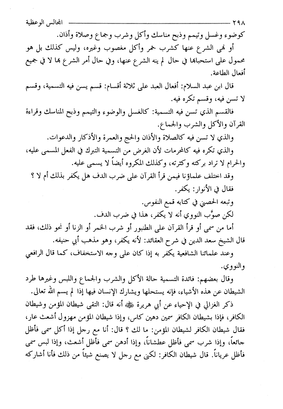 قال ابن عبد السلام: أفعال العبد على ثلاثة أقسام: قسم يسن فيه التسمية، وقسم لا تسن فيه، وقسم تكره فيه.